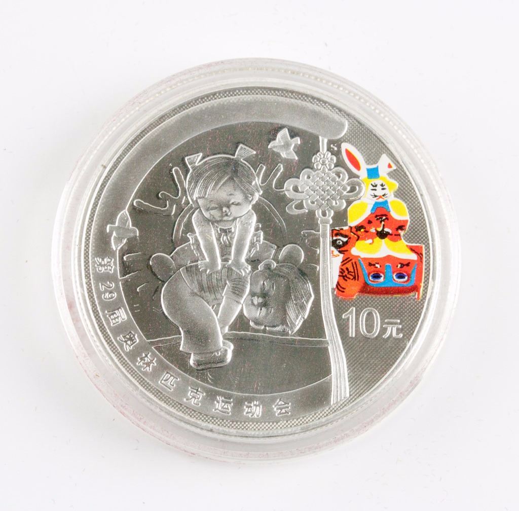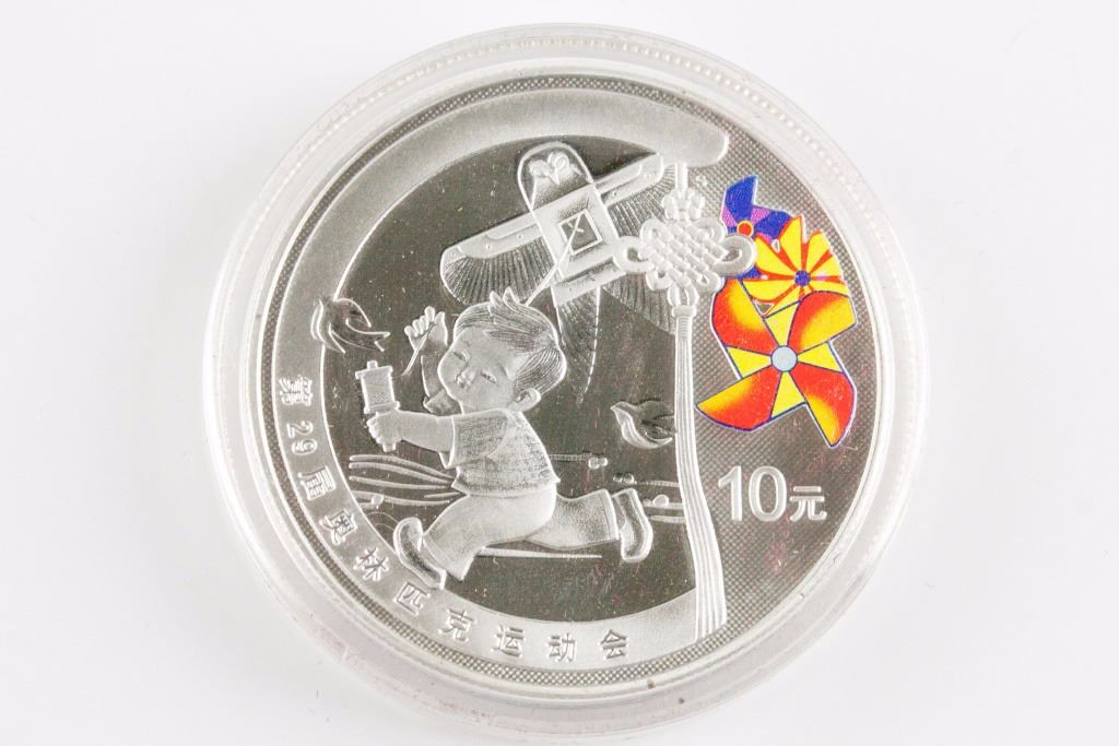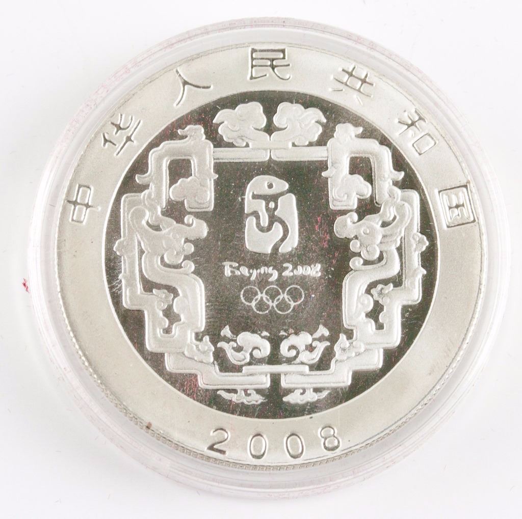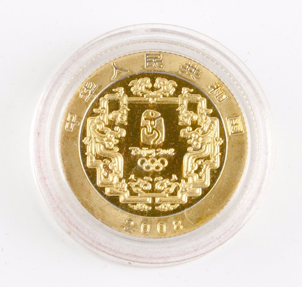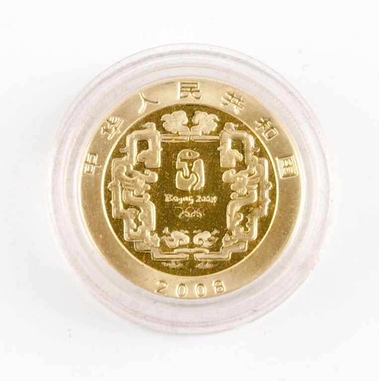 2008 China 29th Olympics Games commemorative six (6) coin set; obverse engraved children playing tradition games, lettering" Di 29 Jie Ao Lin Pi Ke Yun Dong Hui, 10 Yuan, 150 Yuan"; reverse engraved five ring, dragon totem and Beijing Olympic symbol, lettering "Zhong Hua Ren Min Gong He Guo, 2008"; with box; 15 cm x 22 cm, 500 grams