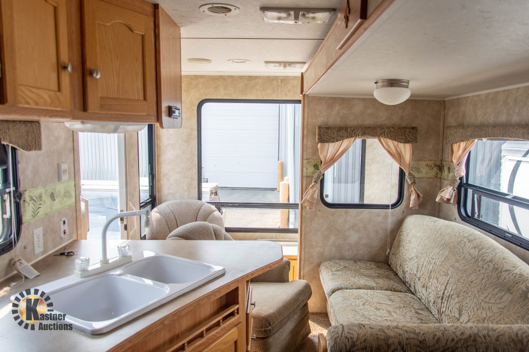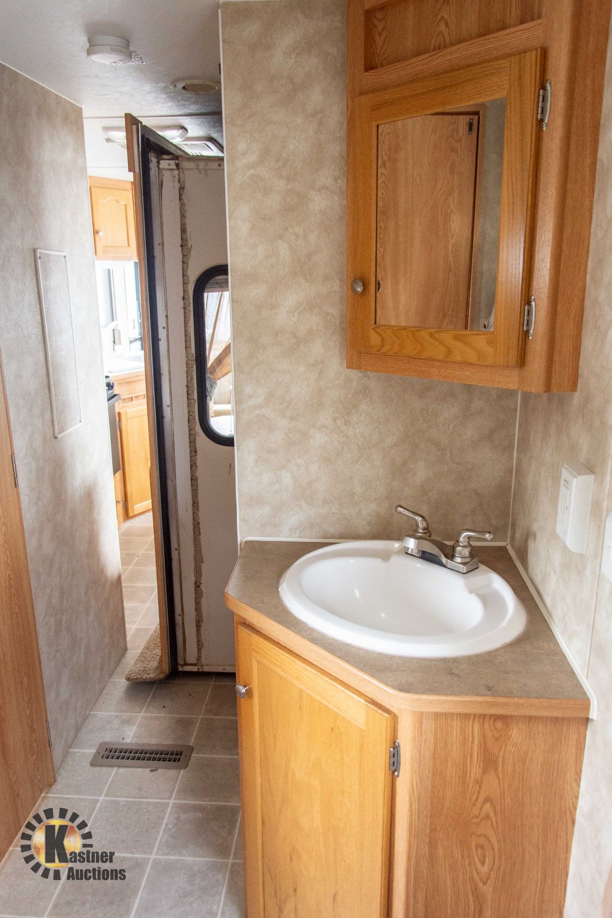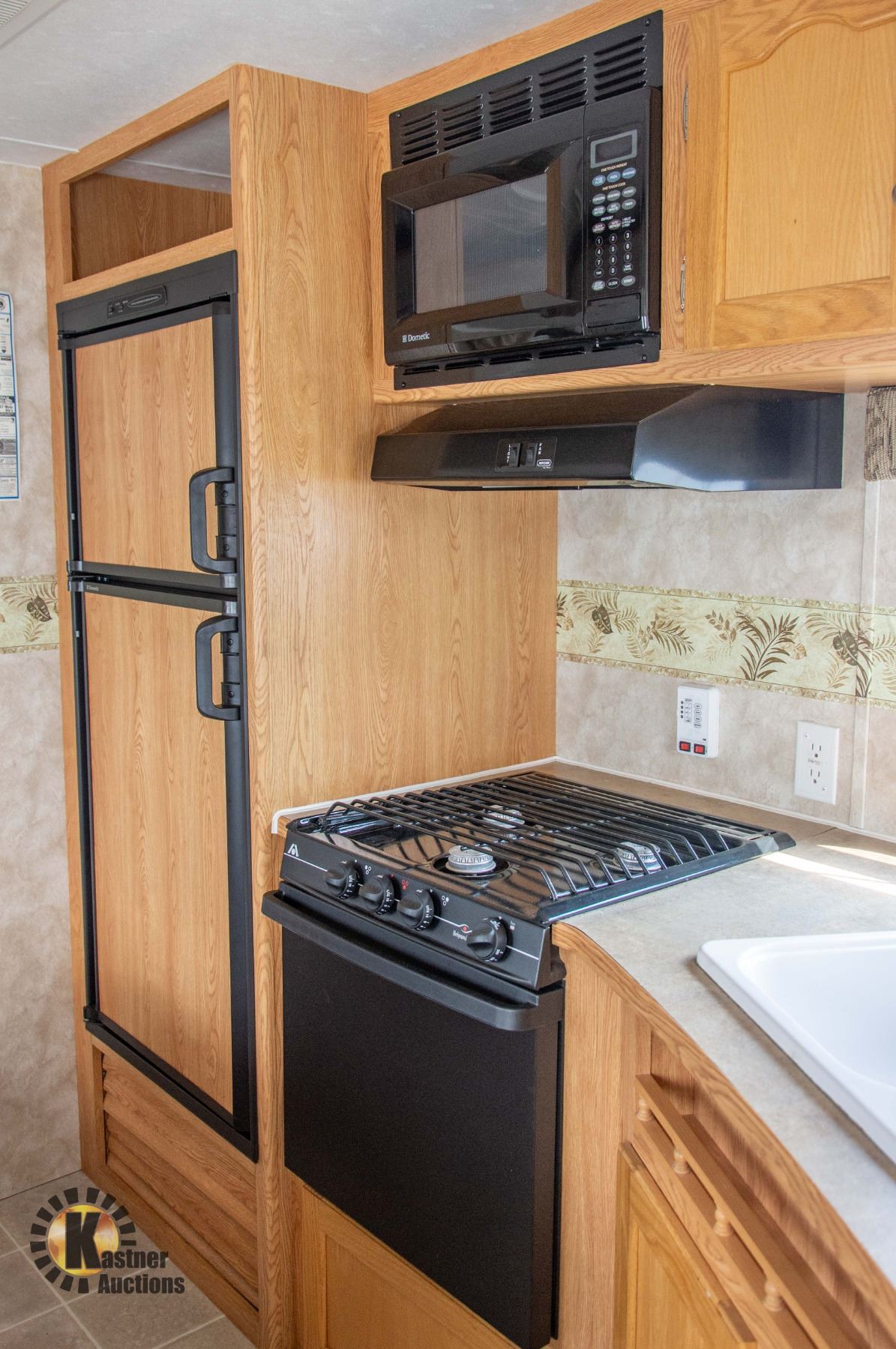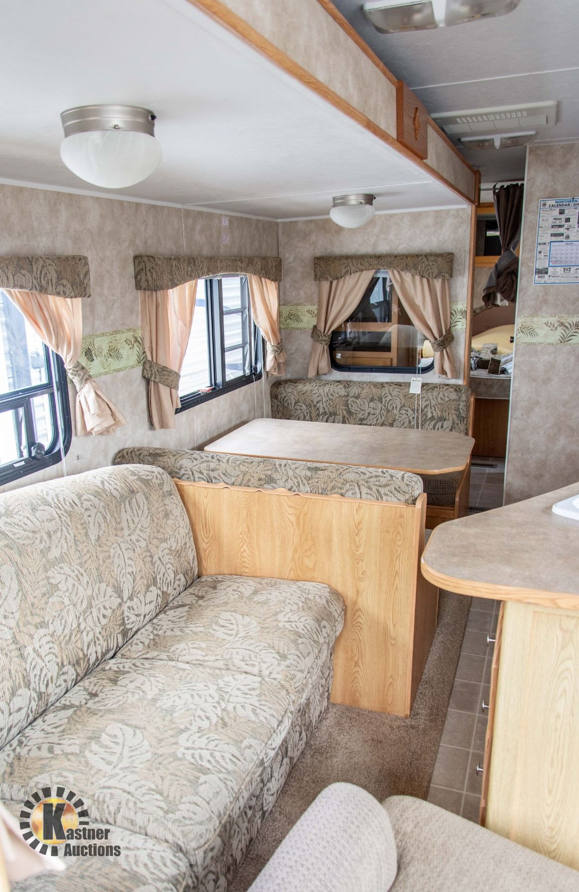 TRAILER FEATURES 4 KEYS, AWNING, QUEEN BED IN MAIN BEDROOM, PRIVATE TOILET AND FULL SHOWER, JACK AND JILL BOOTH, 3 BURNER STOVE WITH OVEN AND MICROWAVE, DOUBLE SINK, FRIDGE AND FREEZER, PULL OUT COUCH, AND TWO CHAIRS.