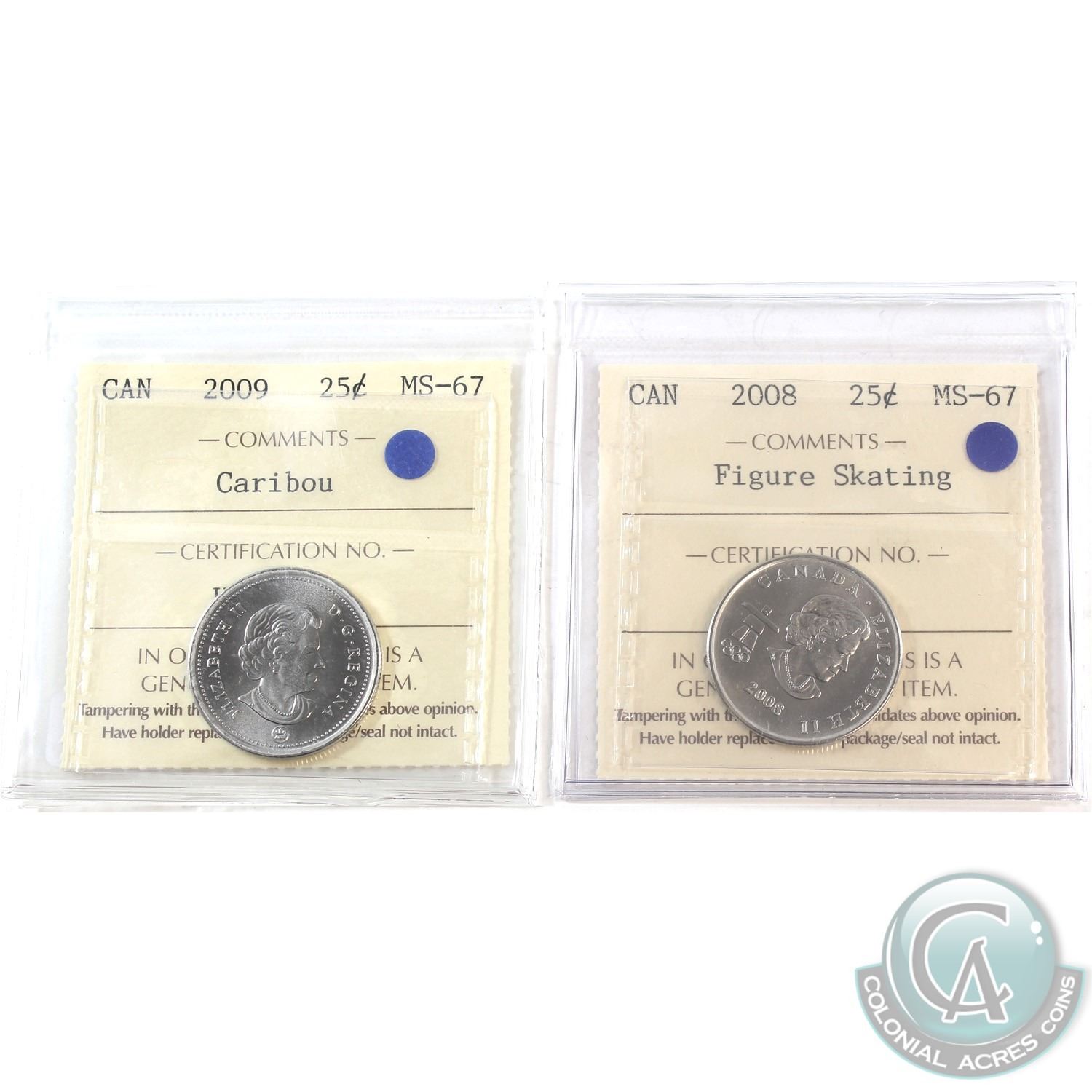 2008 Figure Skating & 2009 Caribou 25-cent ICCS Certified MS-67. 2pcs