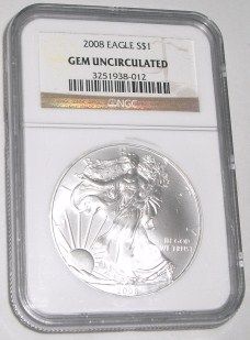 2008 *GEM UNCIRCULATED* CERTIFIED BY NGC SILVER EAGLE SERIAL #3251938-012!! SILVER EAGLE CAME OUT OF SAFE!! ***Coin, Currency & All Items Listed in this auction - Grades, Conditions and Values are not Safe Deposit Coins LLC Responsibilty. Grades, Condition and Values are determined by Consigner(s) & Buyers ONLY