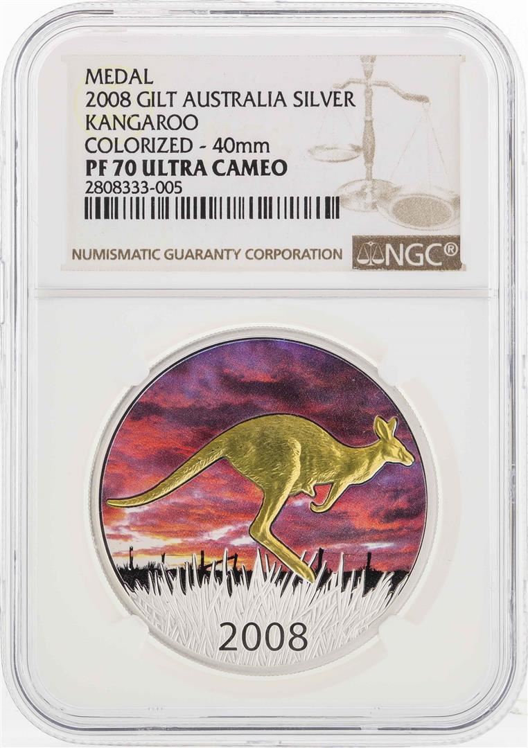 One 2008 Gilt Australia Silver Kangaroo Colorized Coin NGC PF70 Ultra Cameo. NGC Certified.