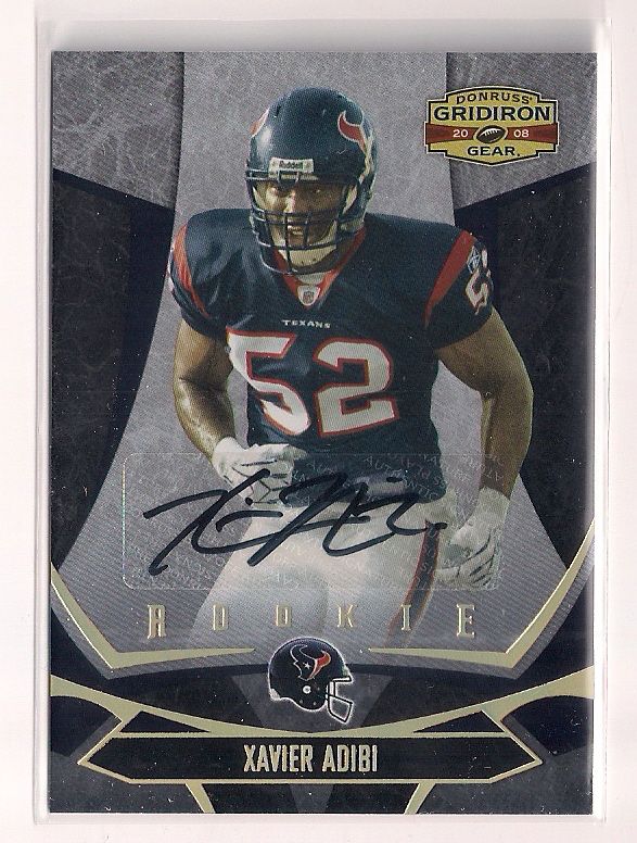2008 Gridiron Gear Xavier Adibi Autographed Rookie Card #199. This Real Rookie Card is signed in Black Sharpee, and is serial numbered 160/250! Card is Near Mint.