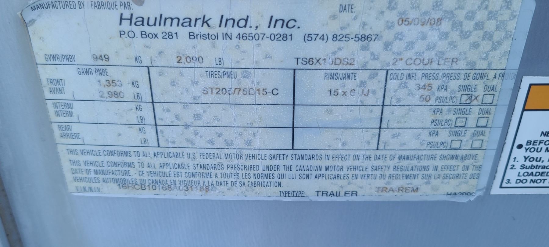2008 HAULMARK SINGLE AXEL CARGO TRAILER C/W BARN DOORS 6FT X10 FT SN 16HCB10168A031188