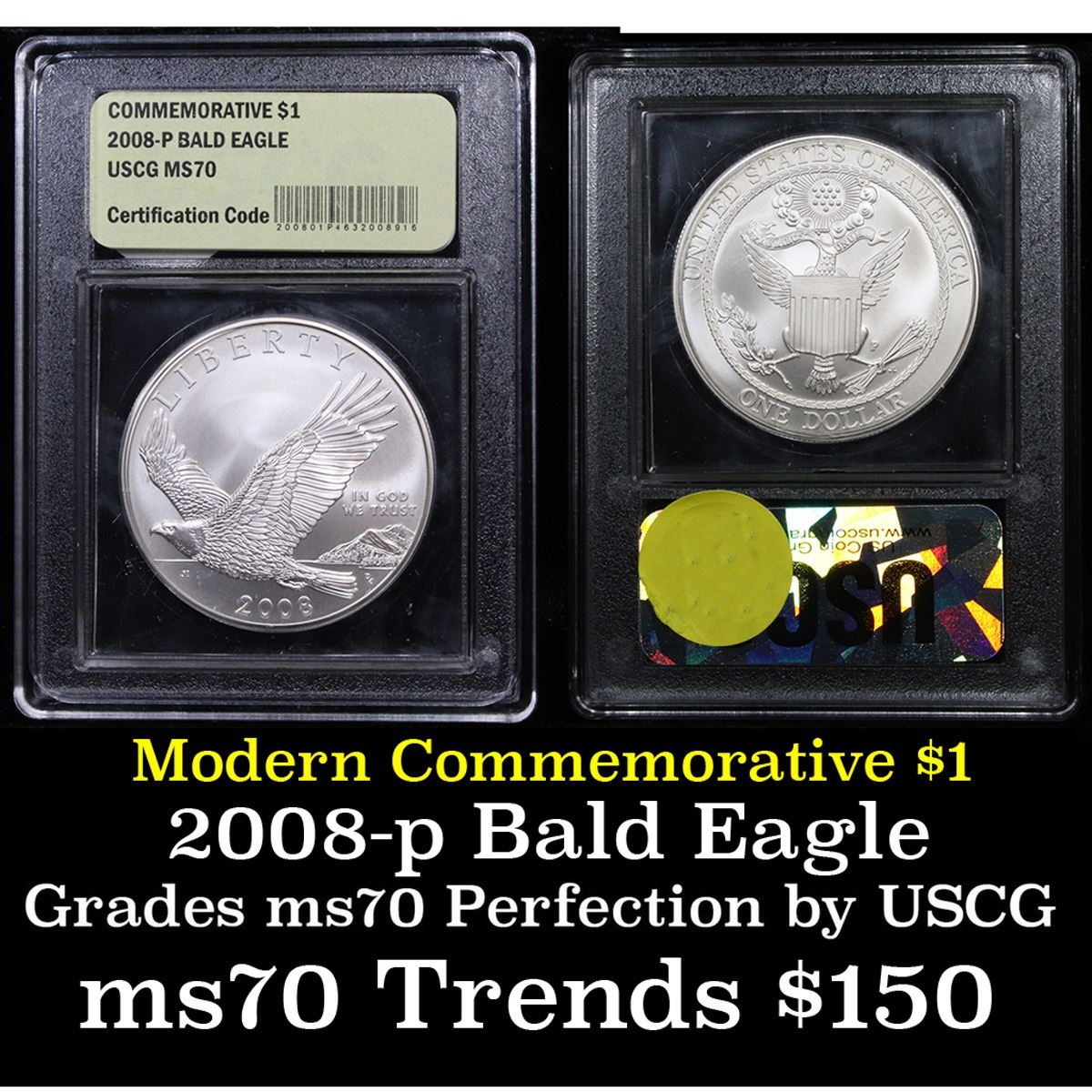 2008-P Bald Eagle Modern Commem Dollar $1 Graded GEM++ Proof Deep Cameo by USCG. 0 Minted to commemorate the recovery of the Bald eagle Species, the dollar illustrates a dramatic Bald eagle in Flight and the seal of the US on the reverse. This Perfect coin is graded perfection by USCG.