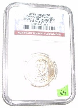 2008-P PRESIDENT DOLLAR JOHN QUINCY ADAMS *CERTIFIED BY NGC FIRST DAY OF ISSUE BU UNC*!! ***Coin, Currency & All Items Listed in this auction - Grades, Conditions and Values are not Safe Deposit Coins LLC Responsibilty. Grades, Condition and Values are determined by Consigner(s) & Buyers ONLY***