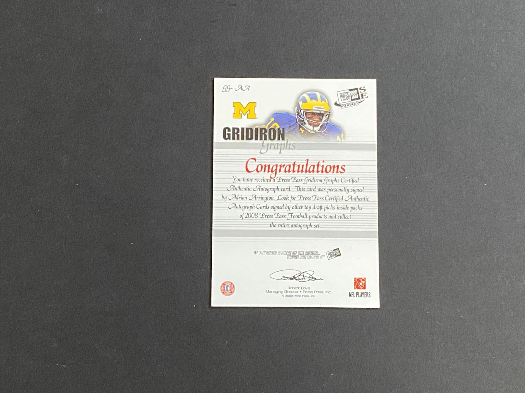 2008 PRESS BOX FOOTBALL AUTOGRAPH ADRIAN ARRINGTON MICHIGAN AUTOGRAPH CARD