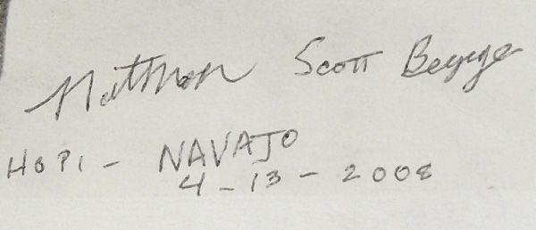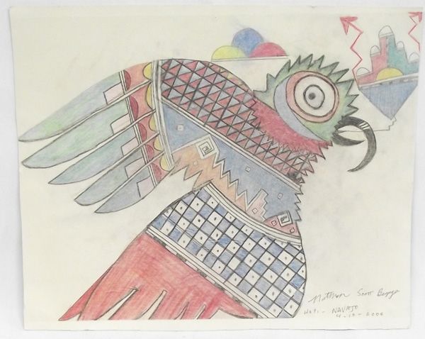 2008 Parrot Drawing attributed to Hopi Navajo Nathan S Begaye 1958-2010. Nathan died at the young age of 52. This is a color drawing by Hopi/Navajo artist Nathan Scott Begaye of Begaye's favorite subject, the Hopi parrot. It is very well done on heavy weight paper with some age and pencil smudging and could use cleaning. Rare opportunity for you to acquire a piece of his art. Signed in lower right corner. Measures 11''H x 14''W.