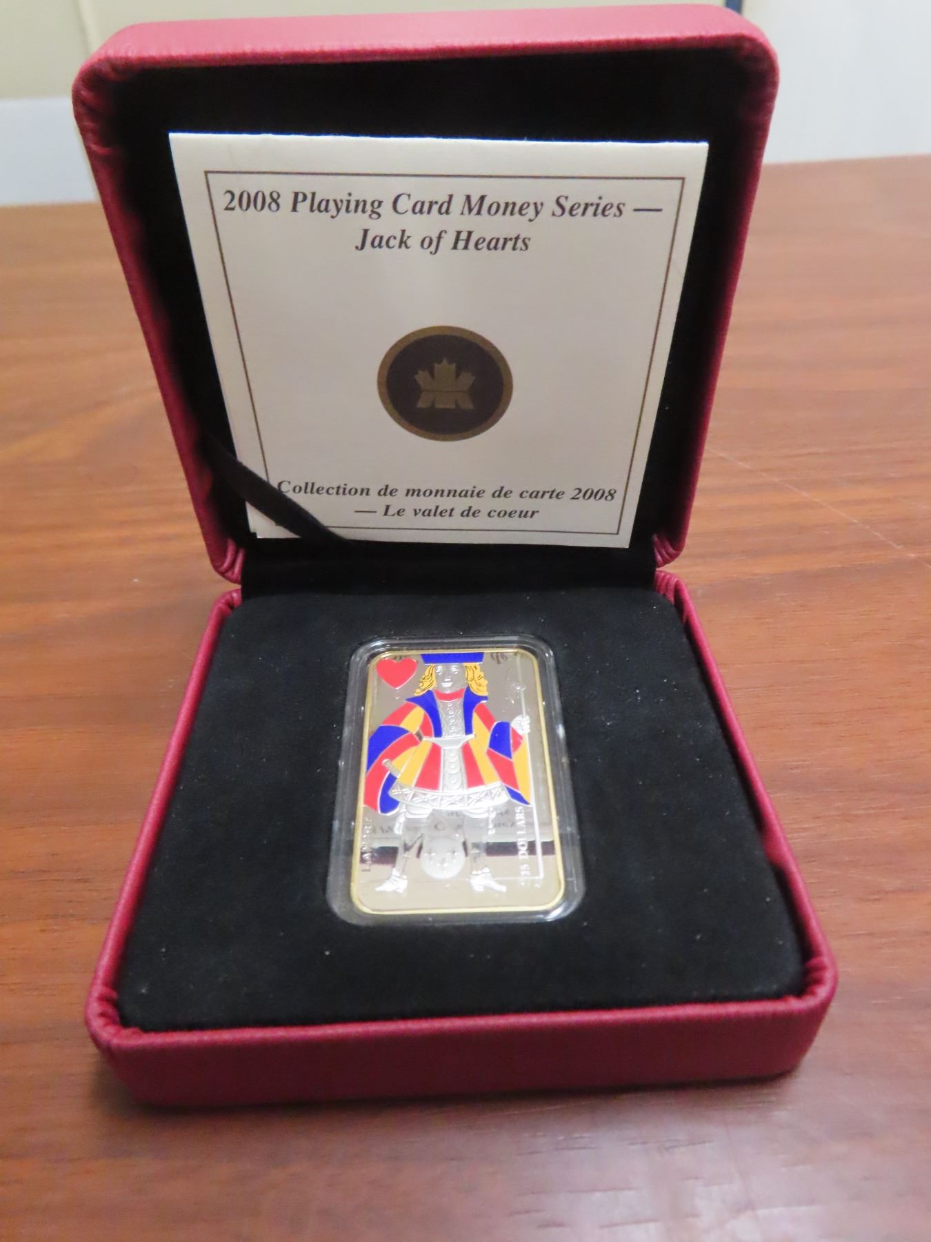 2008 Playing Card Money Jack of Hearts $15. Coloured. Sterling Silver. Proof with Ultra Heavy Cameo. Housed in its original Royal Canadian Mint case & box of issue. Includes Certificate of Authenticity.