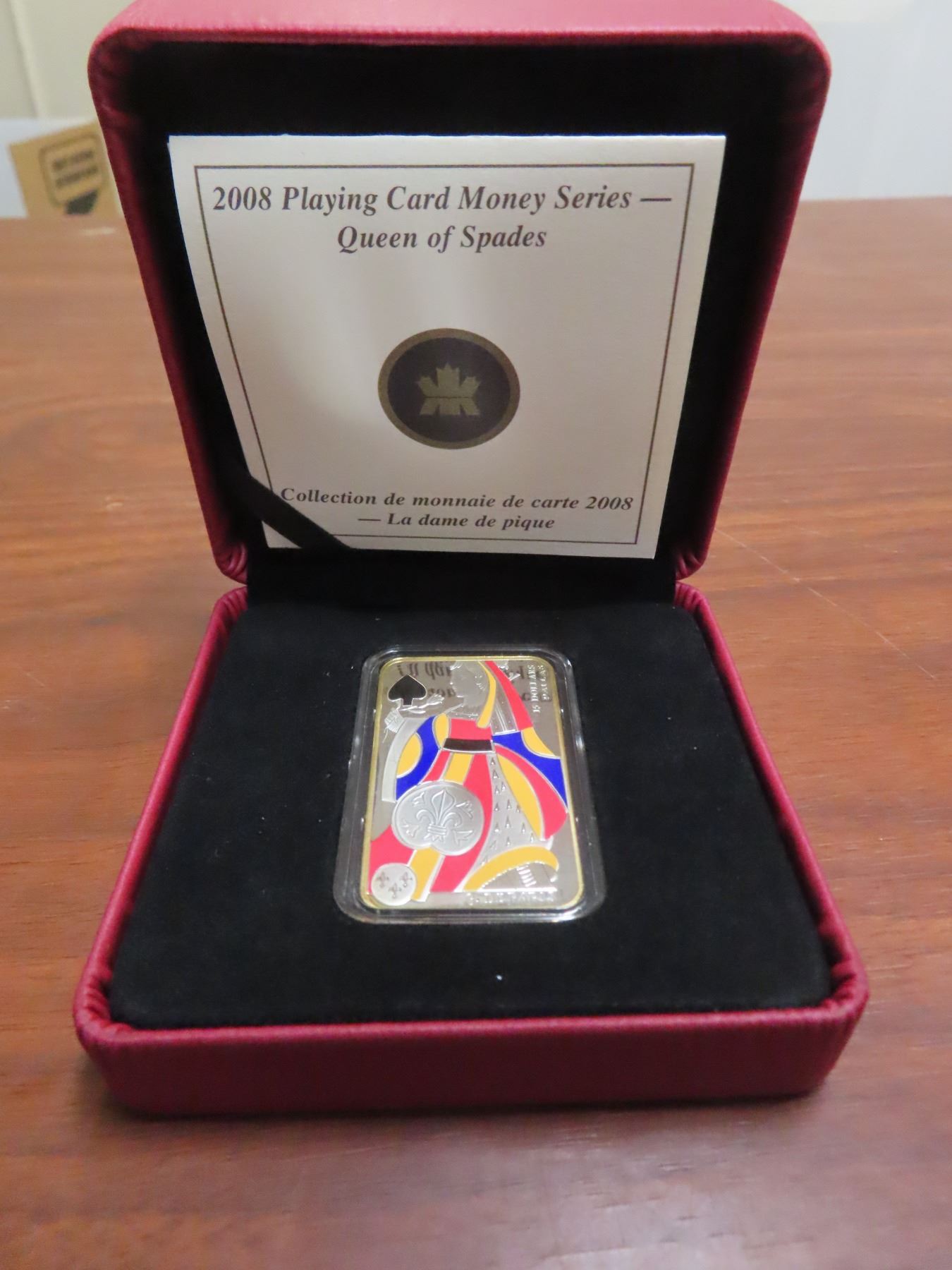 2008 Playing Card Money Queen of Spades $15. Coloured. Sterling Silver. Proof with Ultra Heavy Cameo. Housed in its original Royal Canadian Mint case & box of issue. Includes Certificate of Authenticity.