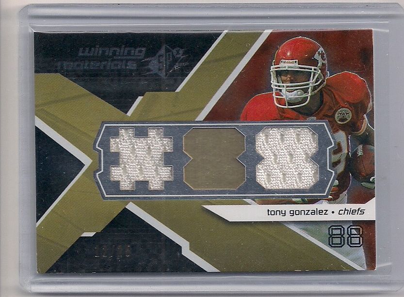 2008 SPx Winning Materials Tony Gonzalez Dual Game-Worn Materials Insert Card. This Short-Printed Insert features Dual Solid White pieces of Game-Worn Material and is serial numbered 12/25! Card is Near Mint.