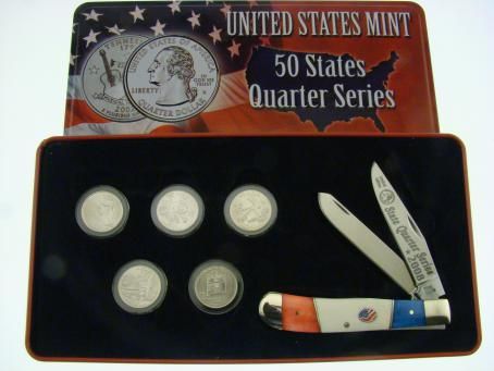 SET INCLUDES ALL FIVES STATE QUARTERS AND A COMBINATION KNIFE WITH 2008 MARKED ON BOLSTER, PICTURES OF EACH STATE QUARTER ON THE BLADE, EST. $35.00 TO $45.00