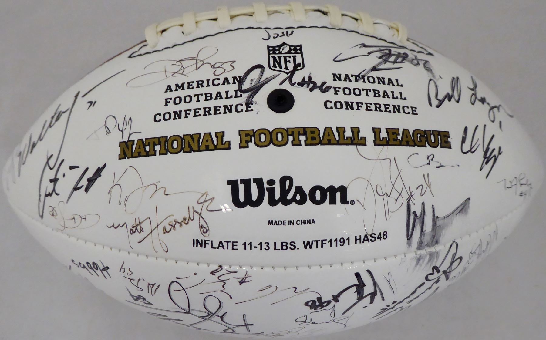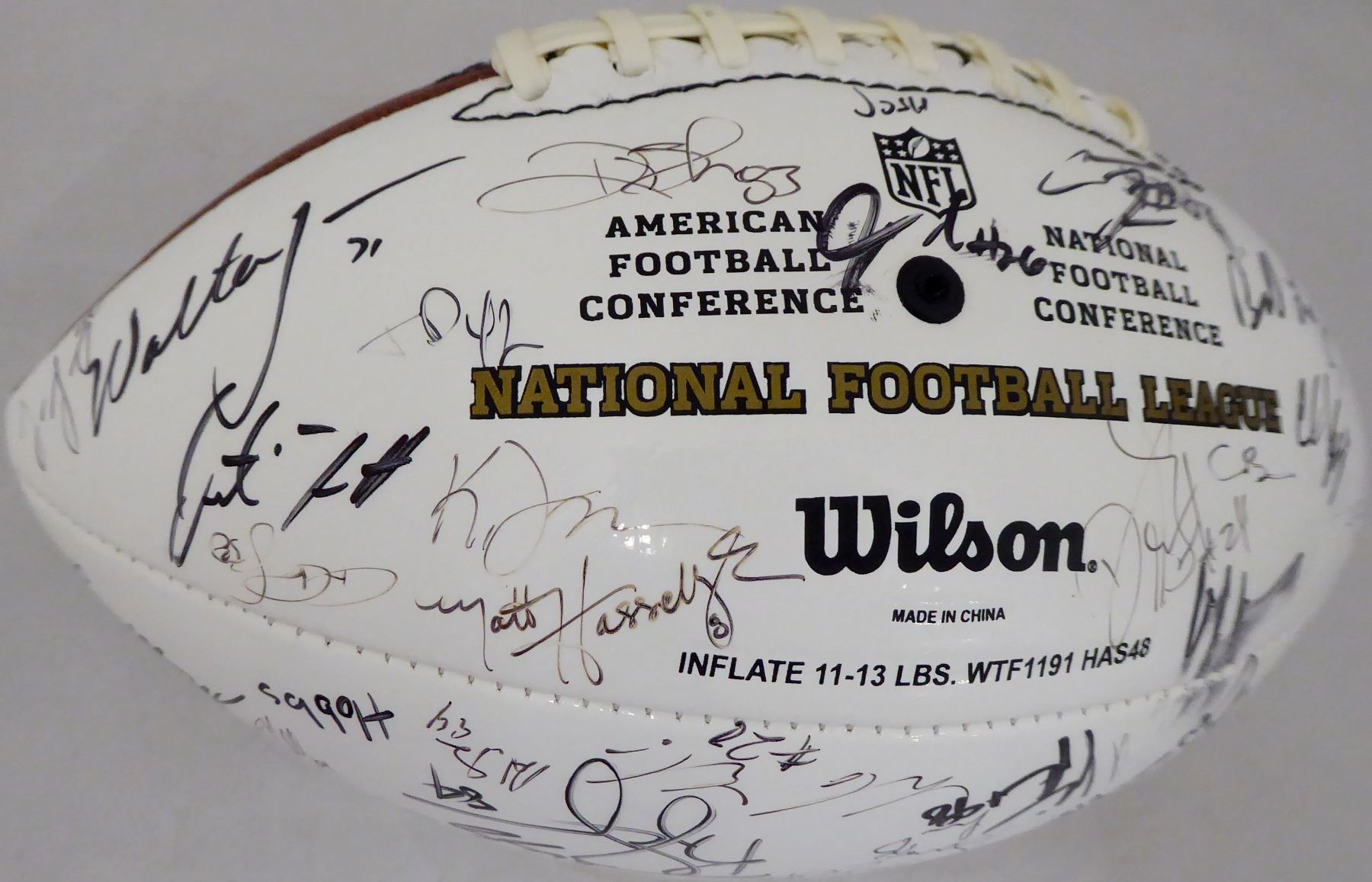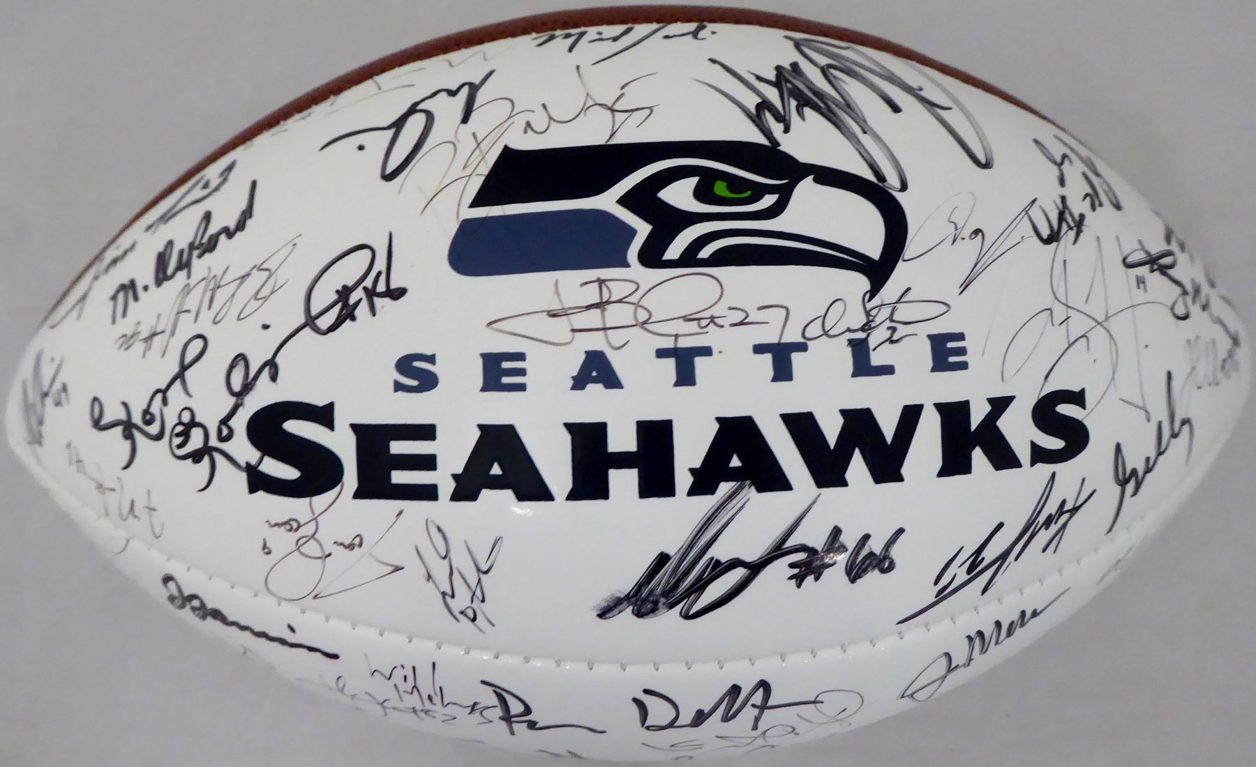 This is a Wilson Logo Football that has been hand signed by 60+ members of the 2008 Seattle Seahawks Team. Signatures include: Matt Hasselbeck, Walter Jones, Marcus Trufant, Lofa Tatupu, Bobby Engram, Jordan Babineaux, John Carlson, Ben Obamanu, Jon Ryan & Deion Branch. NOTE: A couple of the signatures are light or smudged, as shown in the pictures. This item is guaranteed to pass any third party authentication company including Beckett, PSA/DNA, & JSA authentication.