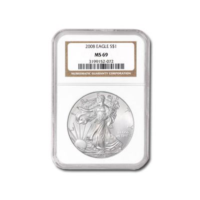 2008 Silver American Eagle (NGC MS-69) **|**|** The 2008 MS-69 NGC Silver Eagle Coin appeals to collectors and investors alike for its beauty and purity. Containing one troy ounce of 99.9% pure silver, the American Silver Eagle Coin is one of the most highly recognized silver bullion coins in the world ; MSRP: $200