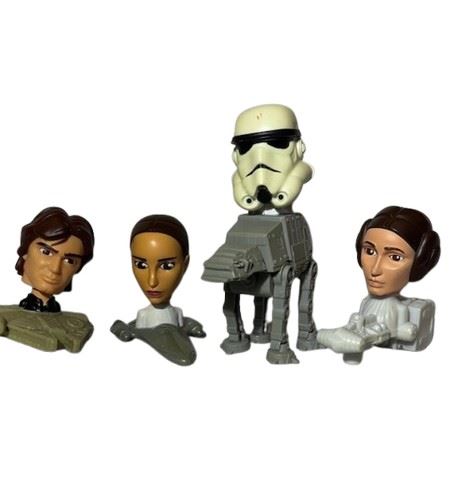 Star Wars: Clone Wars McDonalds Happy Meal Bobble Head Figurines - Han Solo with Millennium Falcon (on wind up wheels) (2008), Storm Trooper with wind up walking AT AT, Princess Leia (on wheels), and Padme Amidala (on wheels) (2008), (3" high)