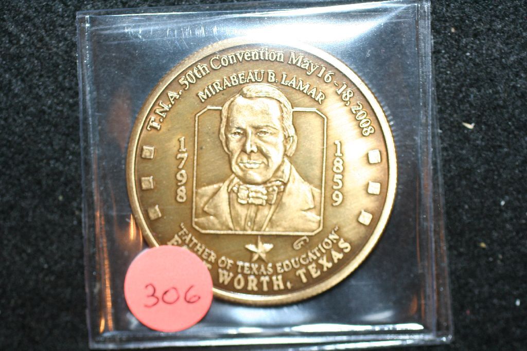 2008 Texas Numismatic Assoc. Inc. 50th Convention Medal; Mirabeau B Lamar "Father of Texas Education: Ft. Worth TX
