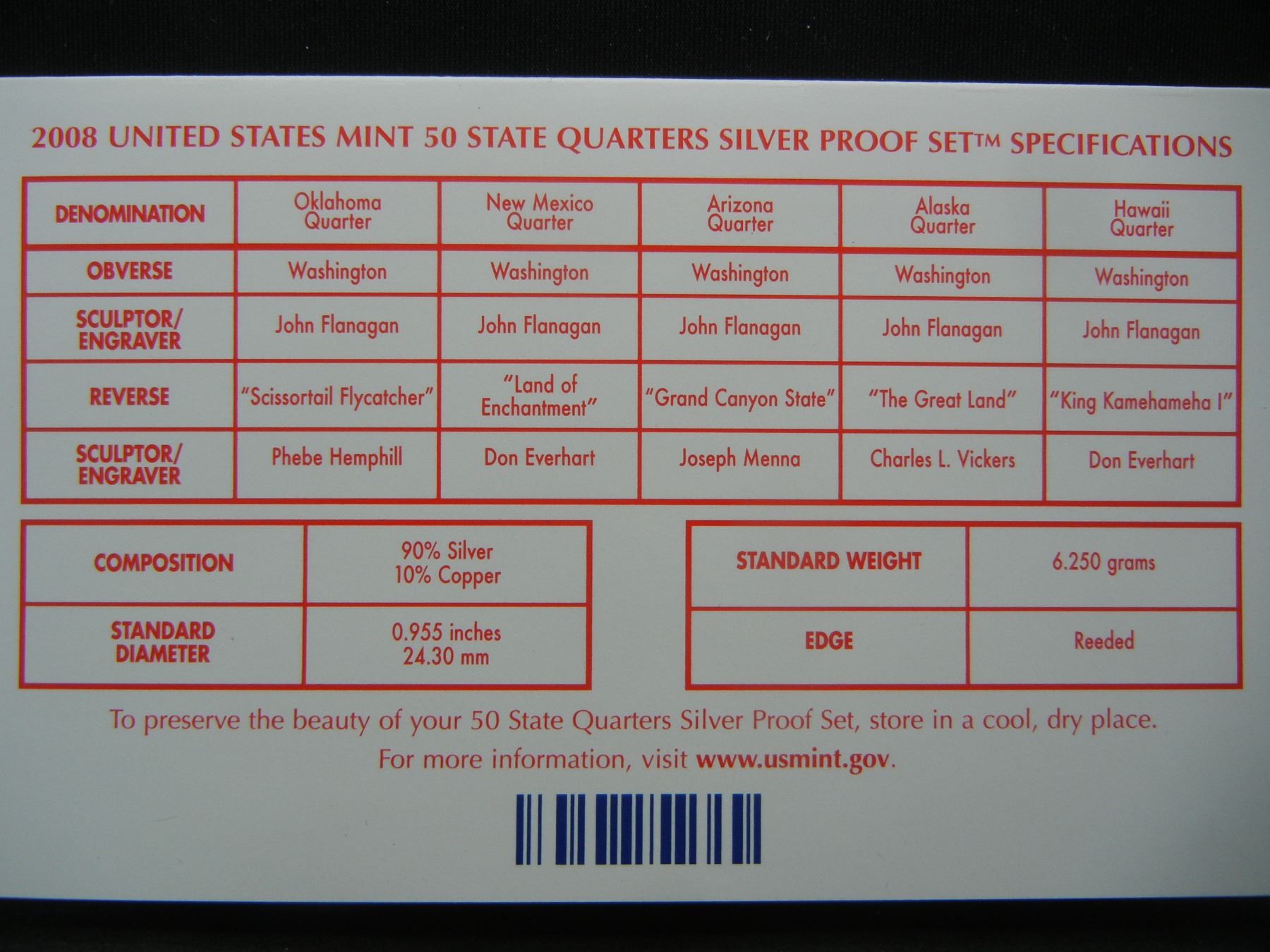 2008 US Mint Silver Quarters Proof Set