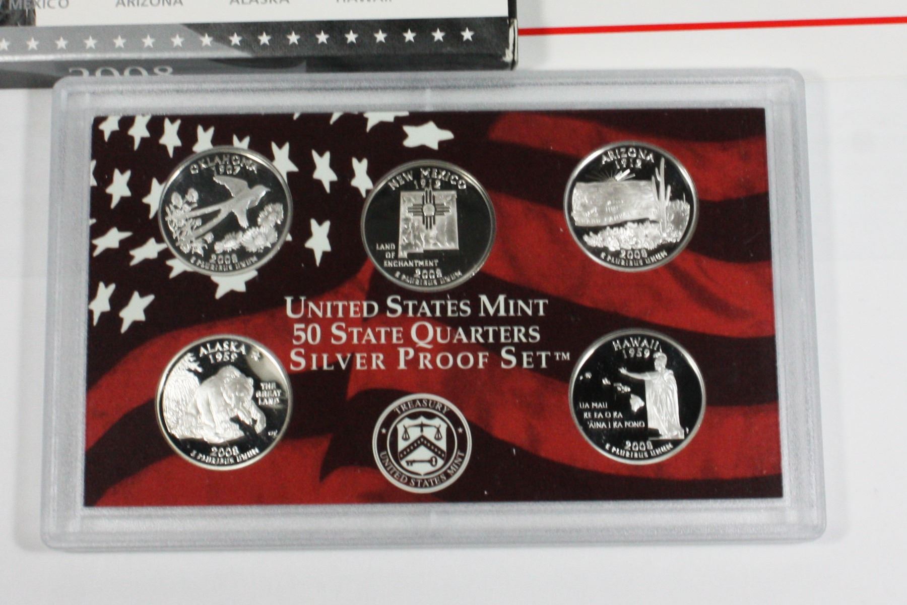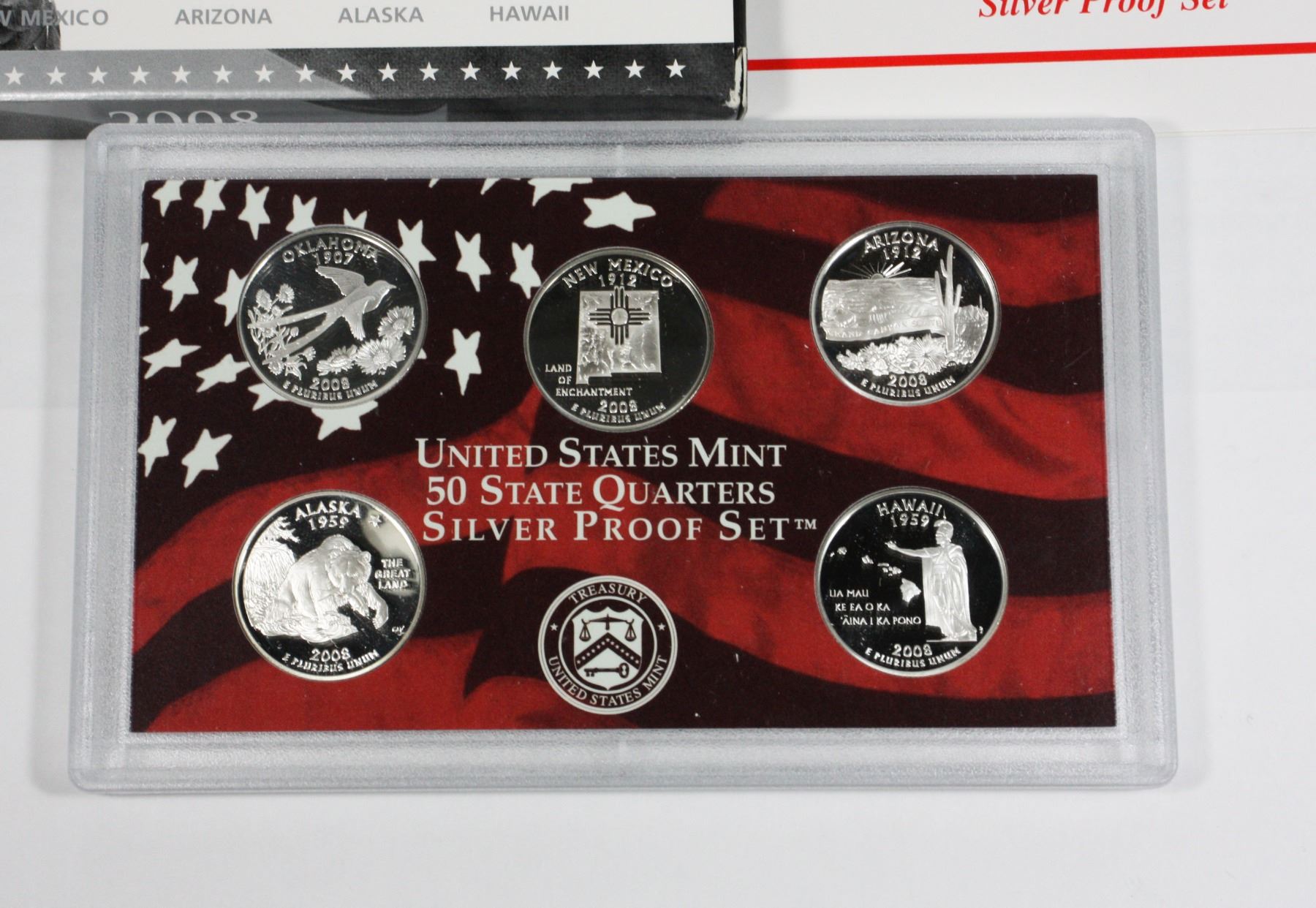 DISPLAY WITH PAPERWORK. 90% SILVER. OKLAHOMA, NEW MEXICO, ARIZONA, ALASKA, HAWAII. DAMAGE TO CARDBOARD BOX