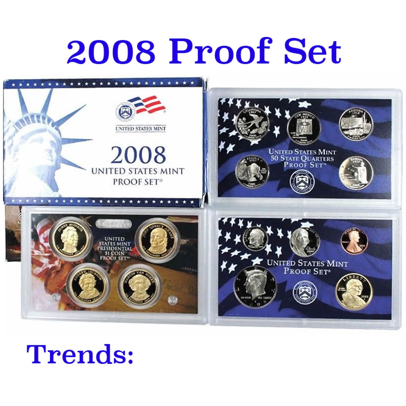 2008 United States Mint Proof Set - 14 Pieces - Extremely low mintage, hard to find. Many people ask why the 2008 set is so much higher priced than the other near dates. It had a slightly lower mintage, but not drastically. Well I just researched this as I too was very curious and here is the answer. The mint shut down sales of the set in June, 5 months earlier than usual and although the mintage of 1.5 million pieces seems near par with the 2-3 million pieces of other near dates, with the mint shutting down sales and many folks who were collecting the whole series, (this was the final piece to the 50 state quarter series) getting shut out, they immediately went to the secondary market. But most of the 1.5 million sold by the mint went to collectors who bought them to keep and did not sell them into the secondary market. So you basically had a shortage of about 1/2 to 1 million sets below demand. The Set contains 4 Proof Presidential Dollars Including the Inaugural first 4, Washington through Madison, 5 Proof State Quarters, a Proof Kennedy Half Dollar, a Proof Roosevelt Dime, as well as 3 additional Proof coins Including the Sacagawea Proof Dollar coin. Complete with Original Packaging and COA.