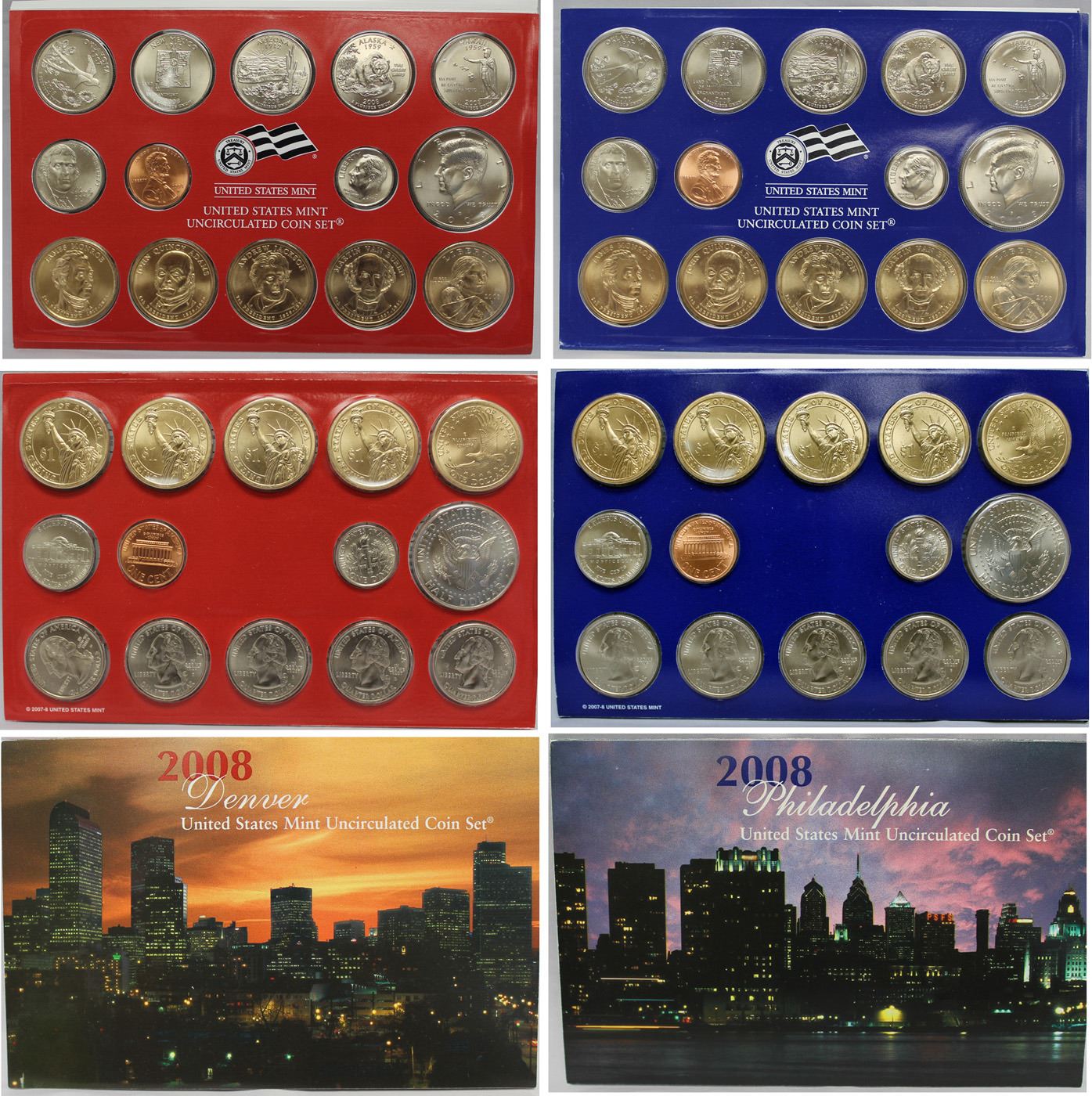 2008 United States Mint Set in Original Government Packaging! 28 Coins Inside!. The 2008 Mint Set included 28 coins, this year included the final five releases in the long running 50 State Quarters Program. The 2008 Mint Sets included 14 coins each from the Philadelphia and Denver Mints covering denominations from one cent to one dollar. The coins with rotating designs were the Presidential Dollars featuring James Monroe, John Quincy Adams, Andrew Jackson, and Martin Van Buren; and the State Quarters featuring Oklahoma, New Mexico, Arizona, Alaska, and Hawaii. Rounding out the set were the coins featuring static designs, the Lincoln Cent, Jefferson Nickel, Roosevelt Dime, Kennedy Half Dollar, and Sacagawea Dollar. Packaging remained similar in style to the previous year, although the images were updated to show views of the city line at dusk. These folders opened to reveal all 28 coins sealed in blister packs, which allowed the obverse and reverses to remain visible. Coin specification information and a certificate of authenticity were included on the back of the illustrated flap.