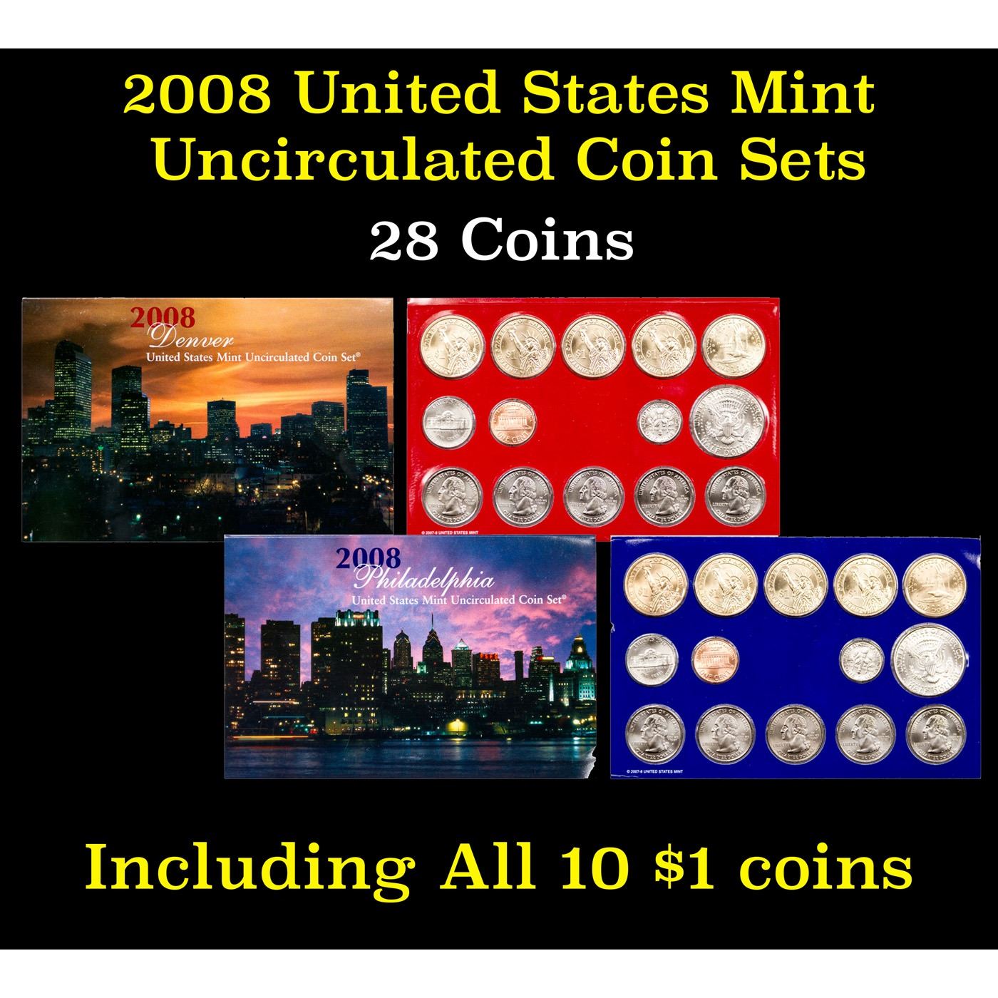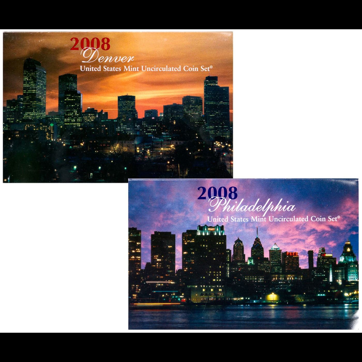 2008 United States Mint Uncirculated Coin Set 28 coins. The 2008-PD Mint Set consisted of two different sets in two blister-style folders. The blue folder contains coins from the Philadelphia Mint, the red folder contains coins from the Denver Mint. Each folder contains the Cent, Nickels, Dime, Half Dollar, and Dollar, alongside the following five 2008 Quarters from the 50 State Quarters® program: Oklahoma, New Mexico, Arizona, Alaska, and Hawaii. Completing each folder are the four 2008 Presidential Dollars: Monroe, Adams, Jackson, and Van Buren.