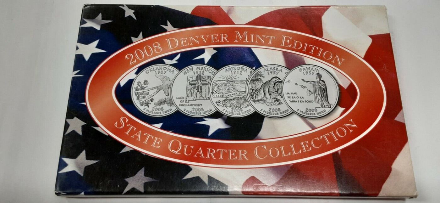 2008 United States Quarters Proof Set Denver Edition, 5 Coins Inside!. In superlative proof quality, the set includes the final five U.S. Mint Statehood issues (Oklahoma, New Mexico, Arizona, Alaska and Hawaii). Each proof quarter is double-struck for crisp raised engravings with frosted finishes, which contrast with dazzling mirror finishes. The set comes in a see-through U.S. Mint plastic case to protect as it displays the proof coins' exquisite beauty.