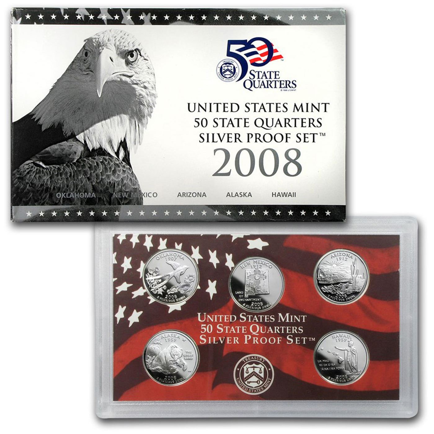 2008 United States Quarters Silver Proof Set - 5 pc set Low mintage. The Set contains 5 90% Silver Proof State Quarters. The Oklahoma, New Mexico, Arizona, Alaska and Hawaii. Total of 5 pieces; Complete with Original Packaging and COA.