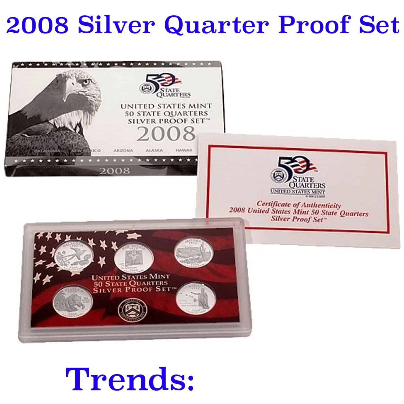 2008 United States Quarters Silver Proof Set - 5 pc set Low mintage. The Set contains 5 90% Silver Proof State Quarters. The Oklahoma, New Mexico, Arizona, Alaska and Hawaii. Total of 5 pieces; Complete with Original Packaging and COA.