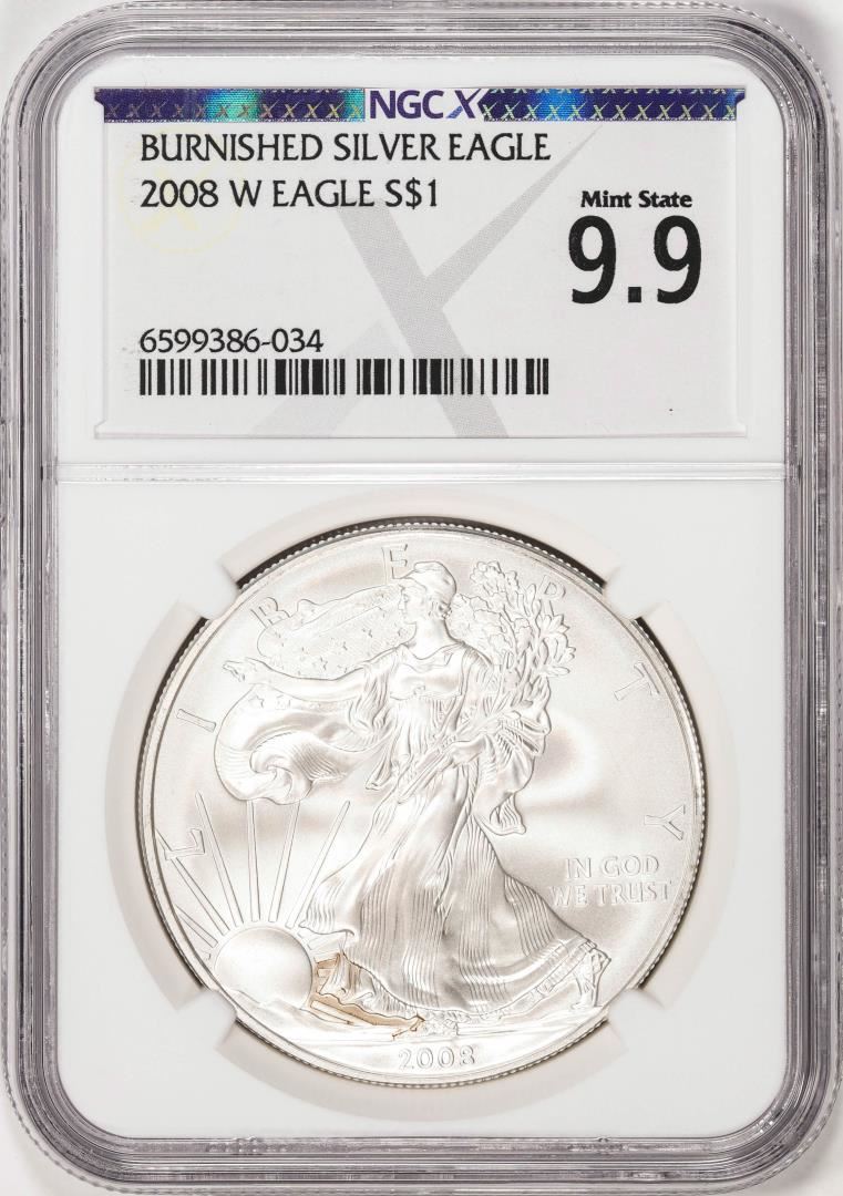 One 2008-W $1 Burnished American Silver Eagle Coin NGCX Mint State 9.9. NGCX Certified.