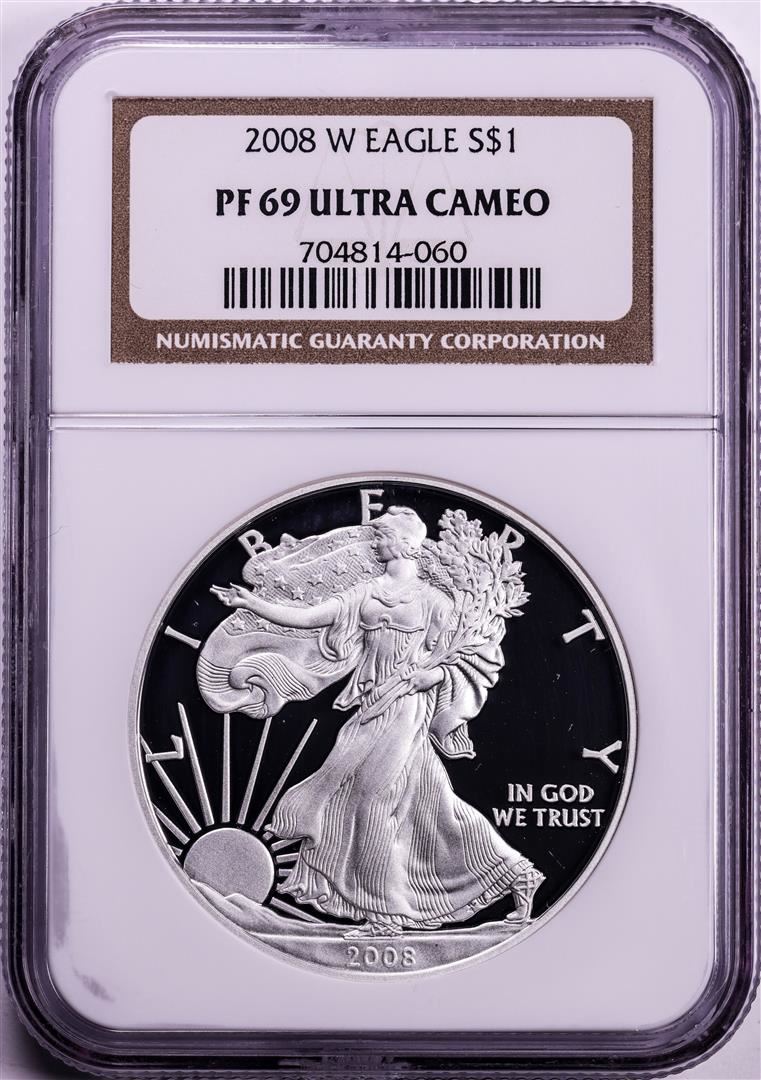 One 2008-W $1 Proof American Silver Eagle Coin NGC PF69 Ultra Cameo. NGC Certified.