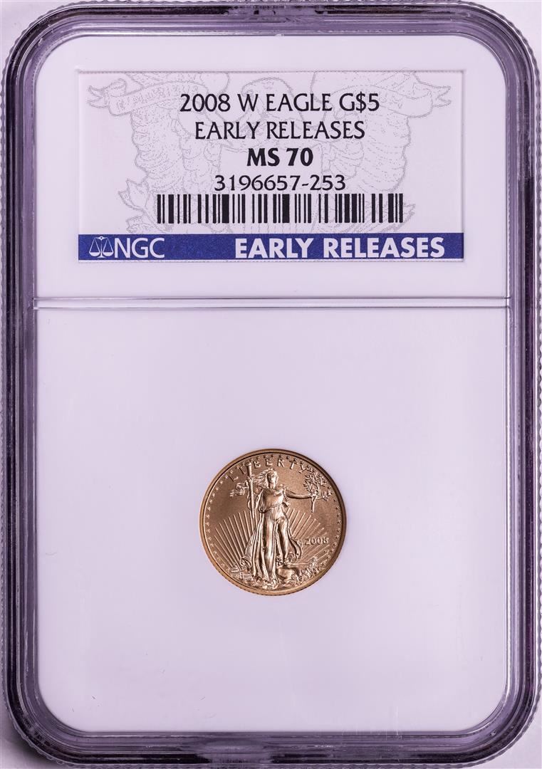 One 2008-W $5 Burnished American Gold Eagle Coin NGC MS70 Early Releases. NGC Certified.