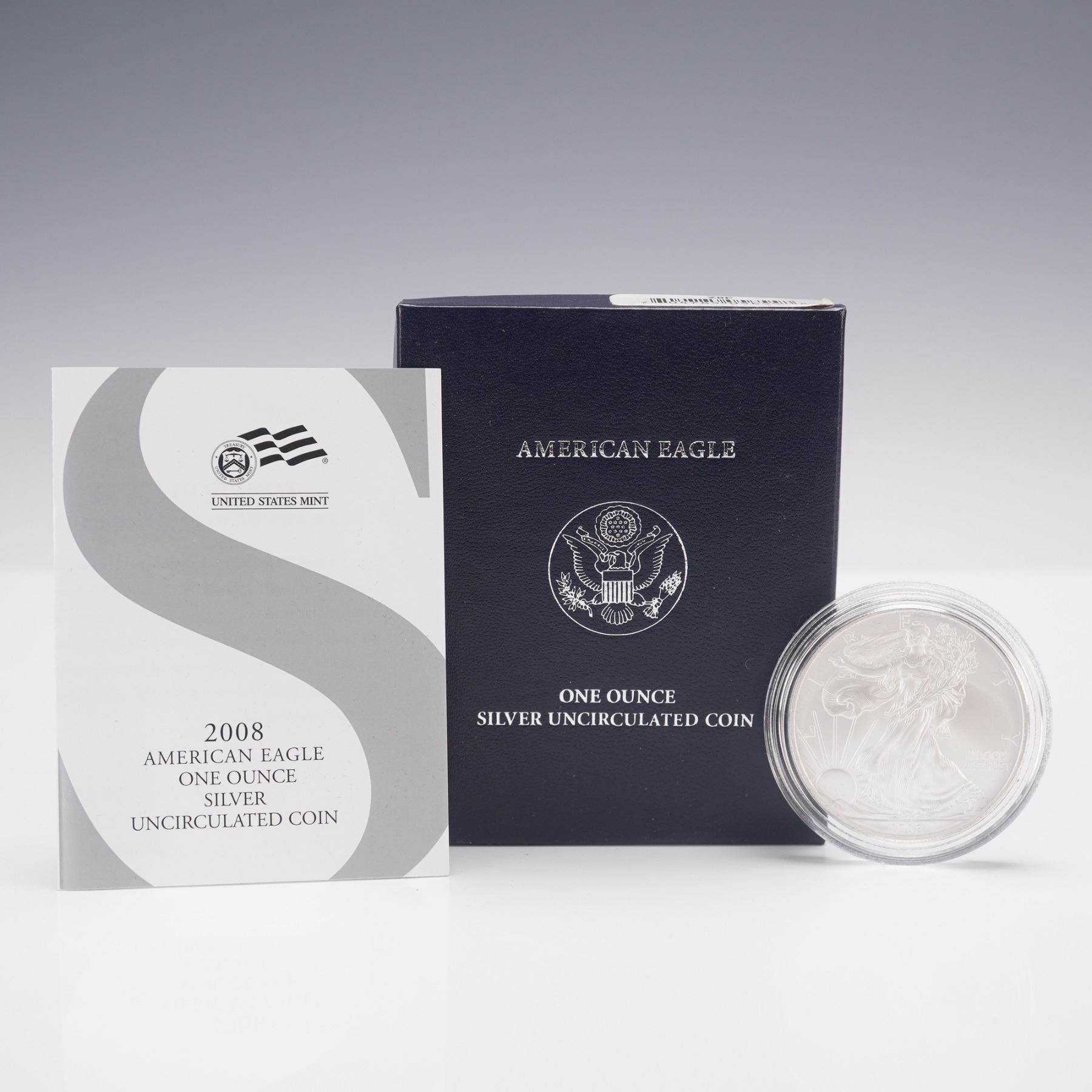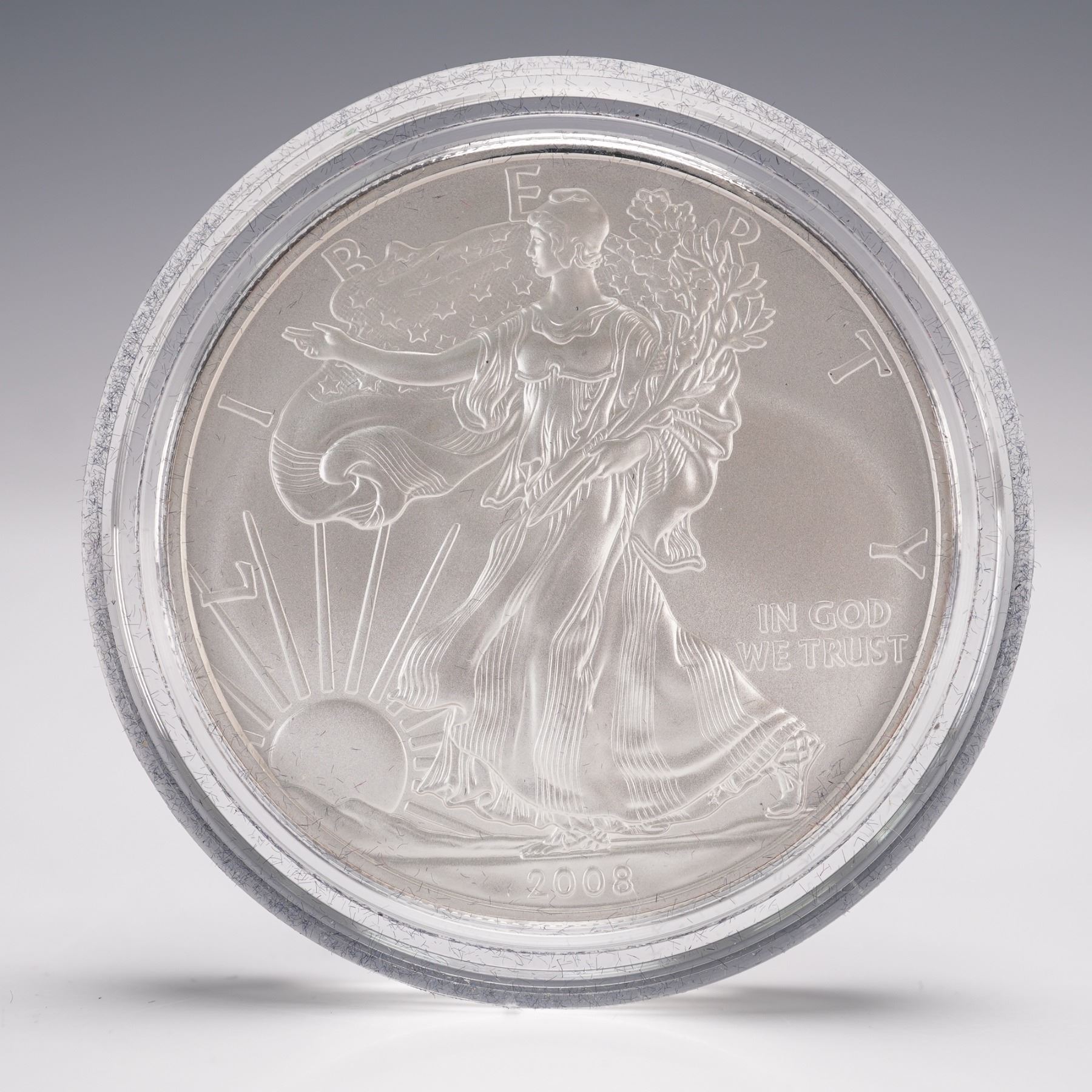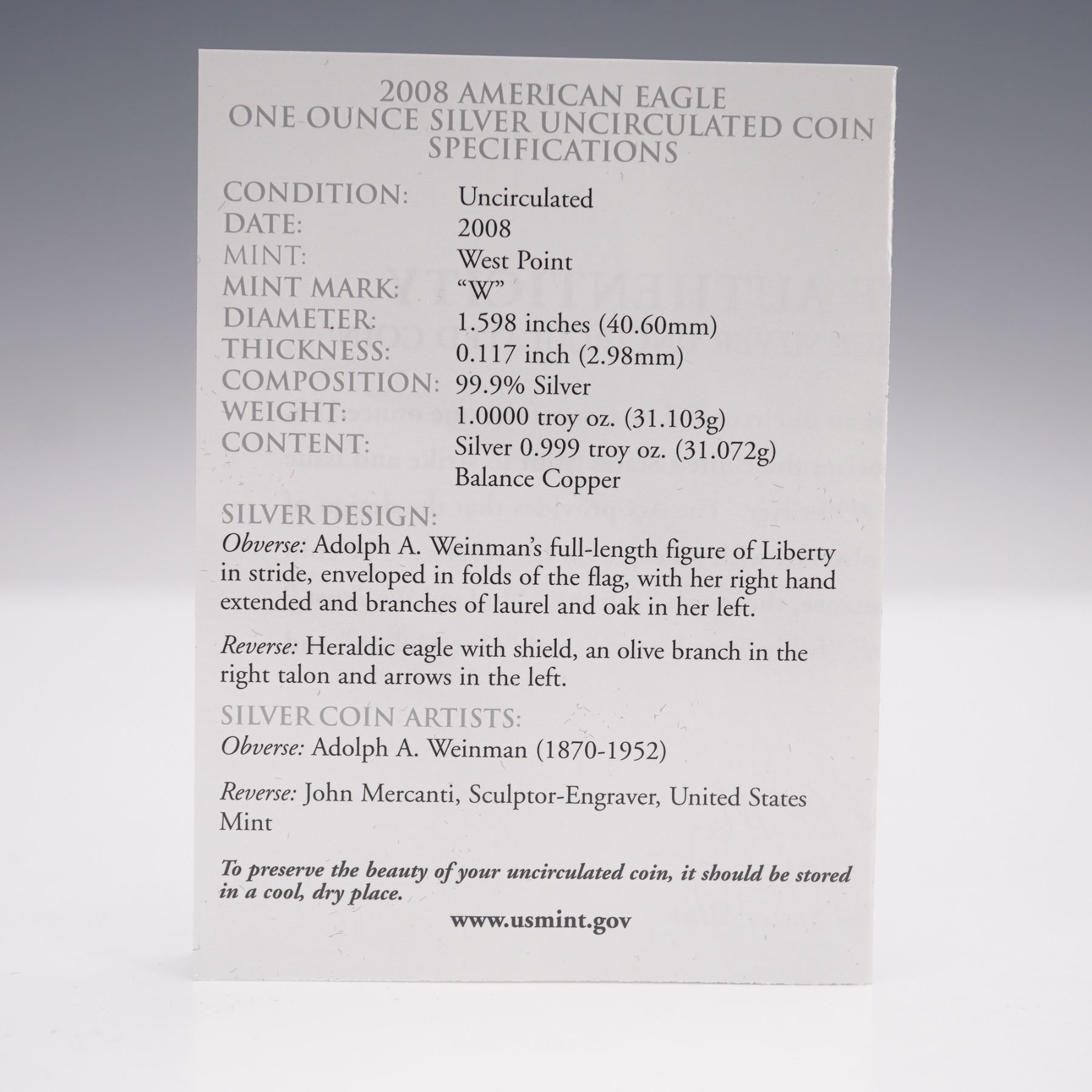 American Eagle one ounce silver uncirculated coin struck at the West Point Mint with the "W" mint mark. Composed of 99.9% silver with a total weight of 1.0000 troy oz. (31.103 g) and a diameter of 40.60 mm. The obverse, designed by Adolph A. Weinman, depicts Liberty in full stride with flowing flag drapery, holding laurel and oak branches. The reverse, by John Mercanti, displays a heraldic eagle with shield, olive branch in the right talon, and arrows in the left.