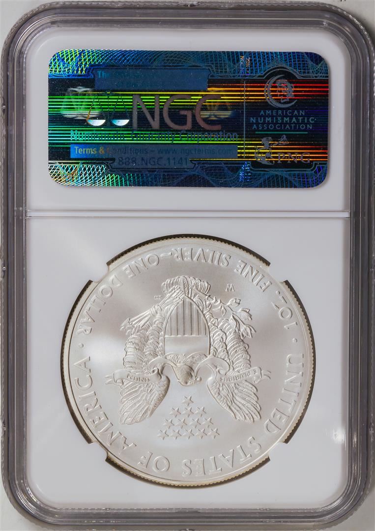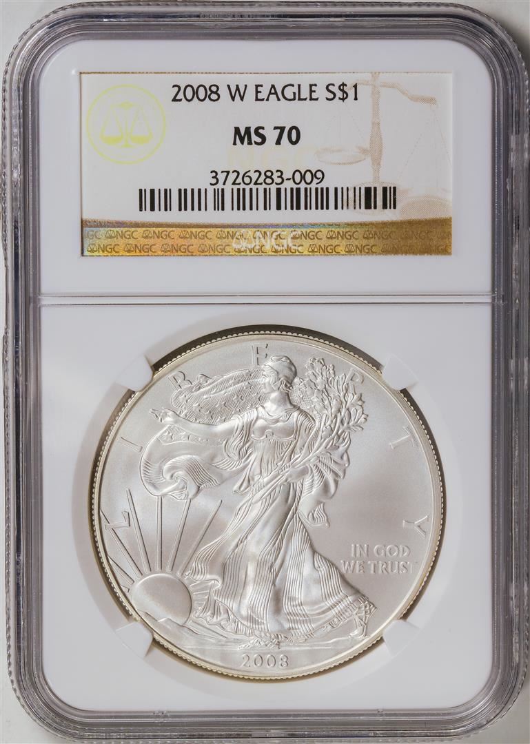One 2008-W American Silver Eagle .999 Fine Silver Dollar Coin NGC MS70.