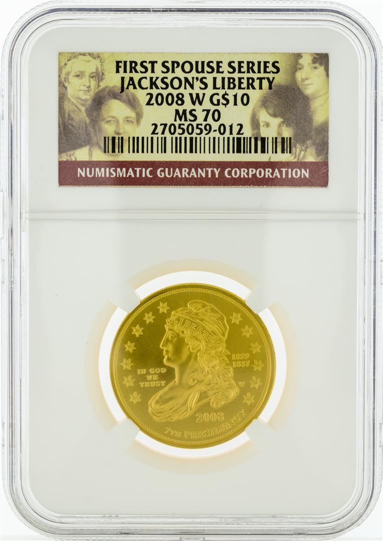 One 2008 W NGC MS70 $10 First Spouse Series Jackson's Liberty Gold Coin. NGC Certified.