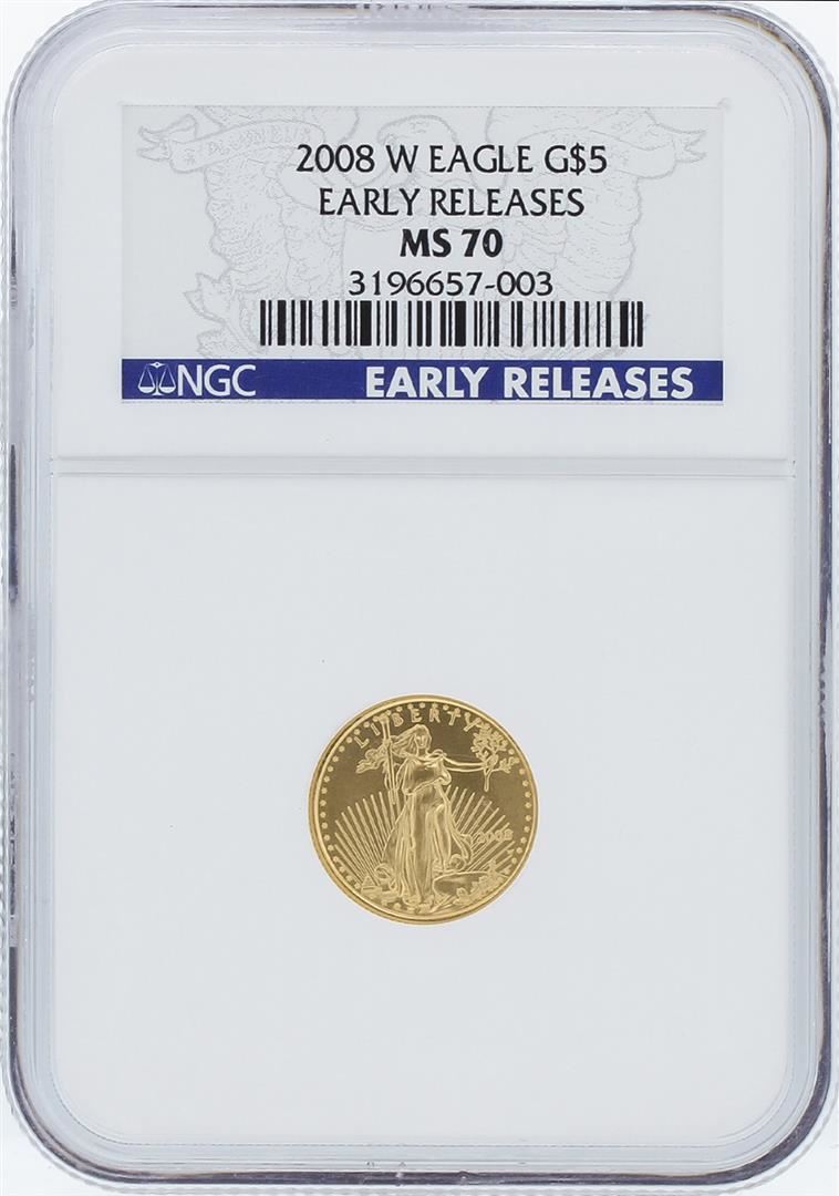 One 2008-W NGC MS70 Early Release American Eagle Gold Coin Set featuring: 2008-W Early Release $5 Tenth-Ounce American Eagle Gold Coin, 2008-W Early Release $10 Quarter-Ounce American Eagle Gold Coin, 2008-W Early Release $25 Half-Ounce American Eagle Gold Coin, 2008-W Early Release $50 One-Ounce American Eagle Gold Coin. NGC Certified.