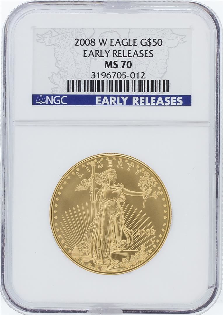 One 2008-W NGC MS70 Early Release American Eagle Gold Coin Set featuring: 2008-W Early Release $5 Tenth-Ounce American Eagle Gold Coin, 2008-W Early Release $10 Quarter-Ounce American Eagle Gold Coin, 2008-W Early Release $25 Half-Ounce American Eagle Gold Coin, 2008-W Early Release $50 One-Ounce American Eagle Gold Coin. NGC Certified.