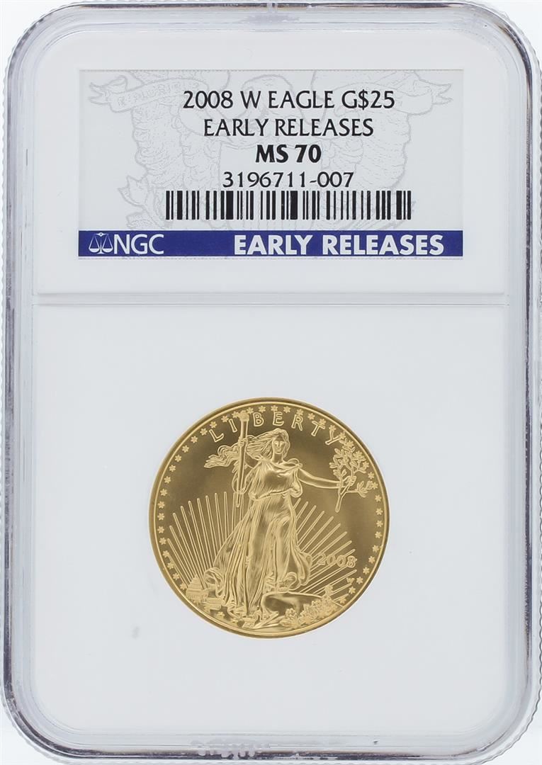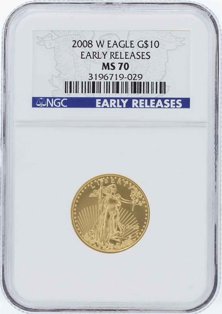 One 2008-W NGC MS70 Early Release American Eagle Gold Coin Set featuring: 2008-W Early Release $5 Tenth-Ounce American Eagle Gold Coin, 2008-W Early Release $10 Quarter-Ounce American Eagle Gold Coin, 2008-W Early Release $25 Half-Ounce American Eagle Gold Coin, 2008-W Early Release $50 One-Ounce American Eagle Gold Coin. NGC Certified.