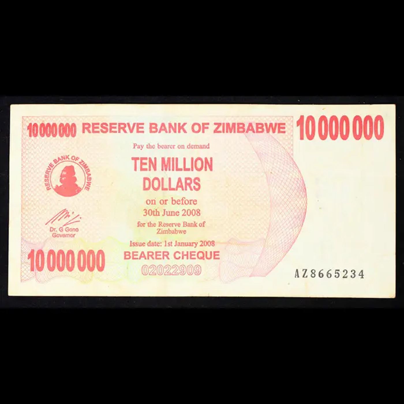 2008 Zimbabawe 10 Million Dollar Note P# 55A Grades vf++.