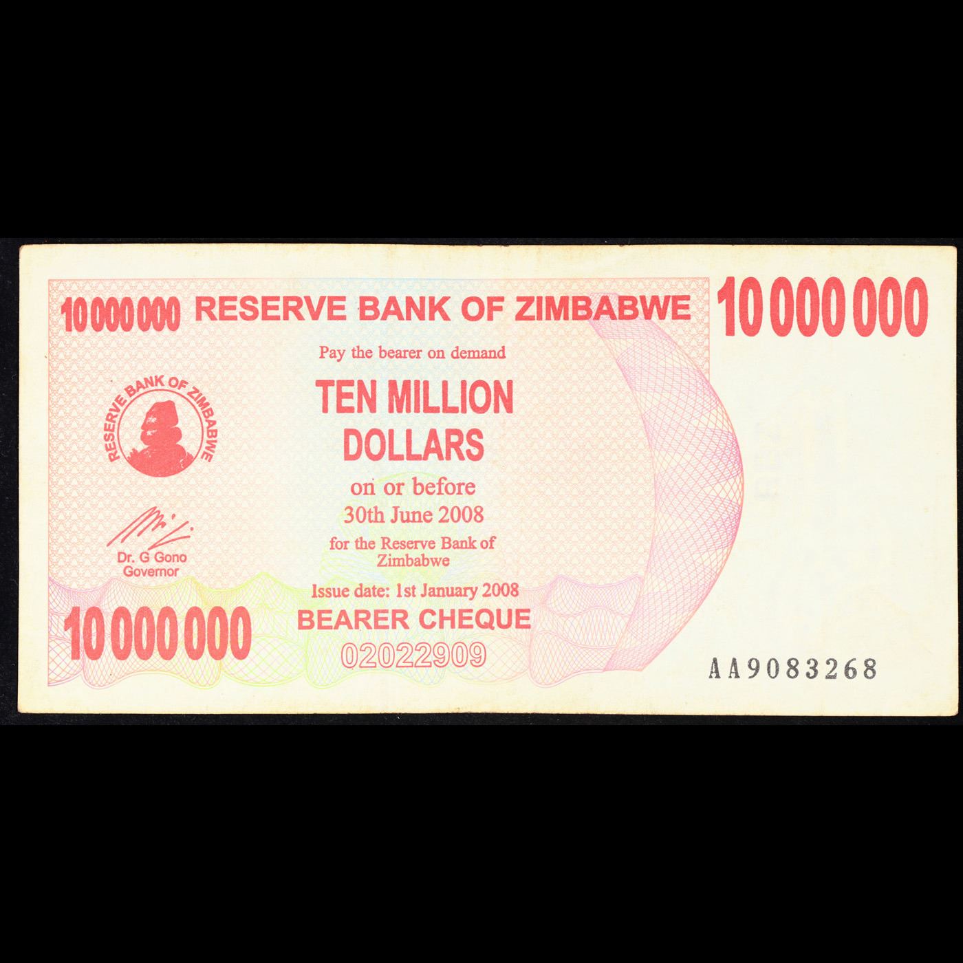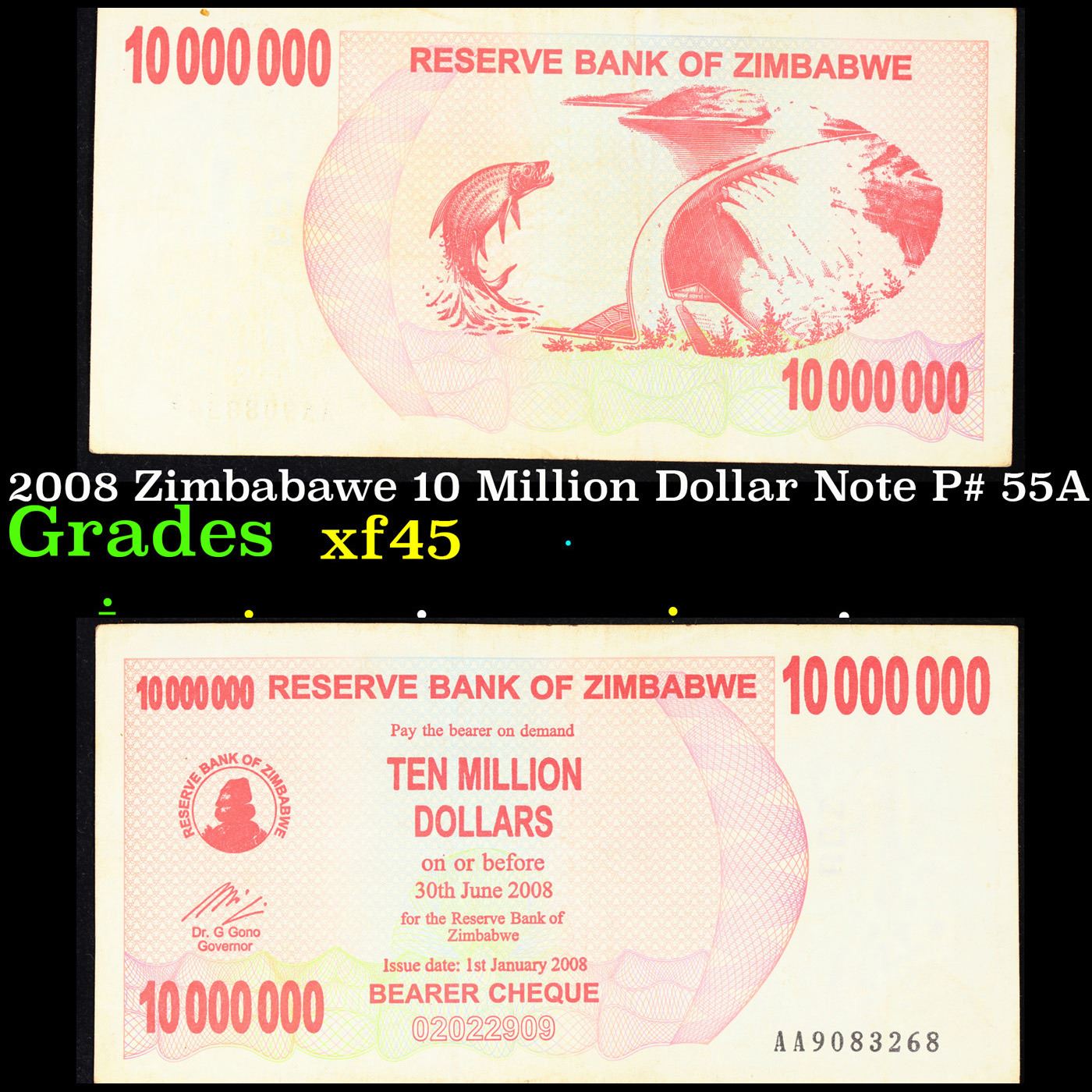 2008 Zimbabawe 10 Million Dollar Note P# 55A Grades xf+.
