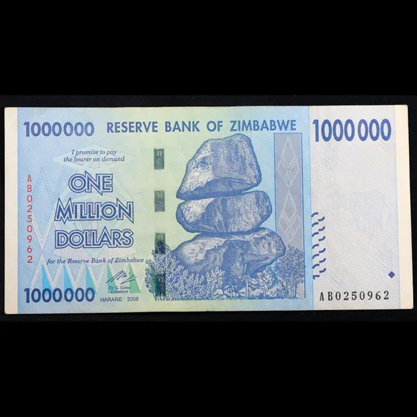 2008 Zimbabwe 1 Million Dollar Notes P: 77 Grades Choice AU/BU Slider. During the years of 2008 and 2009, The inflation rate of the Zimbabwe Dollar Grew to 250,000,000% at its peak. This was later linked to the Central Bank uncontrollably printing money and the global economic crisis and the time.