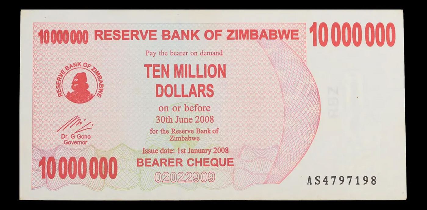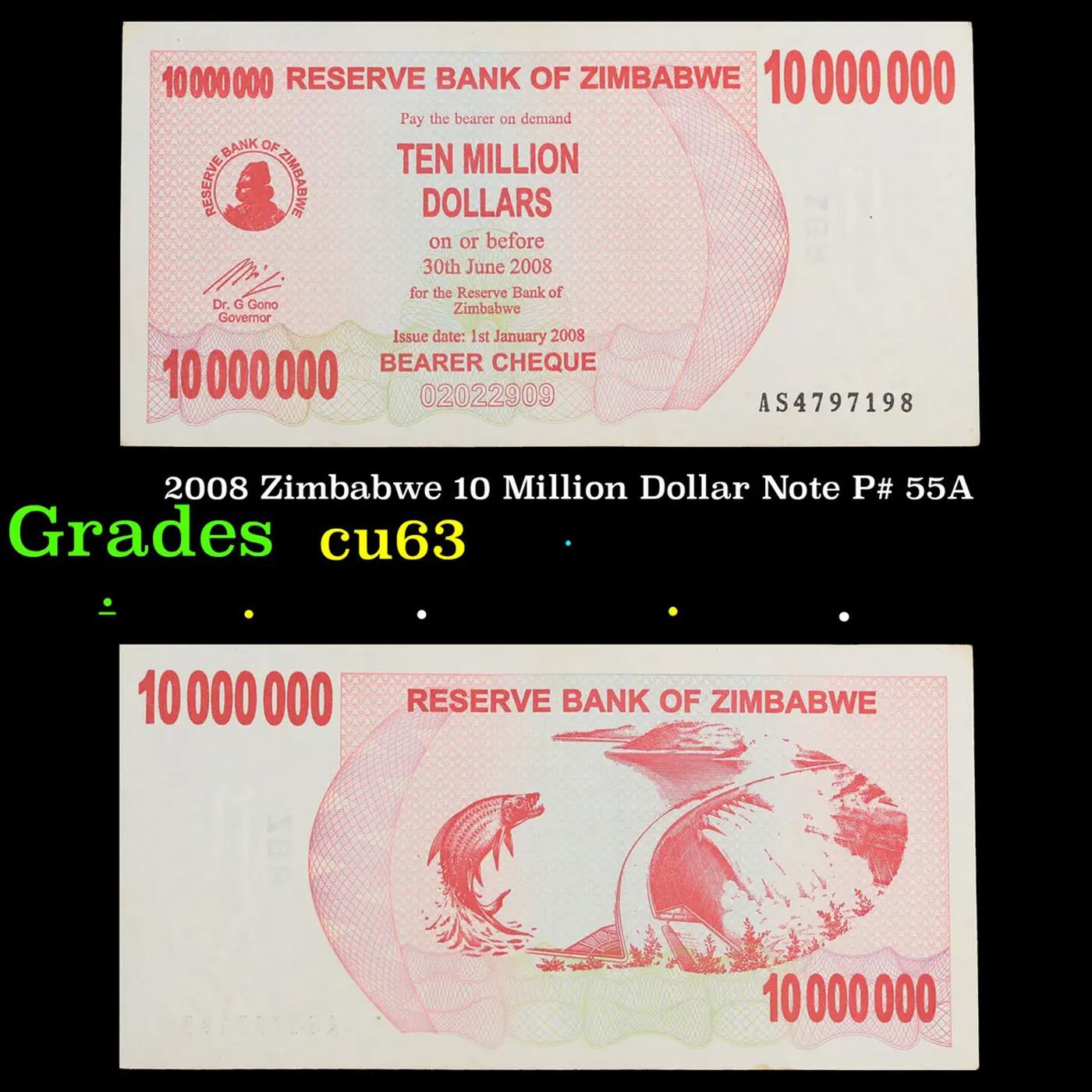 2008 Zimbabwe 10 Million Dollar Note P# 55A Grades Select CU.