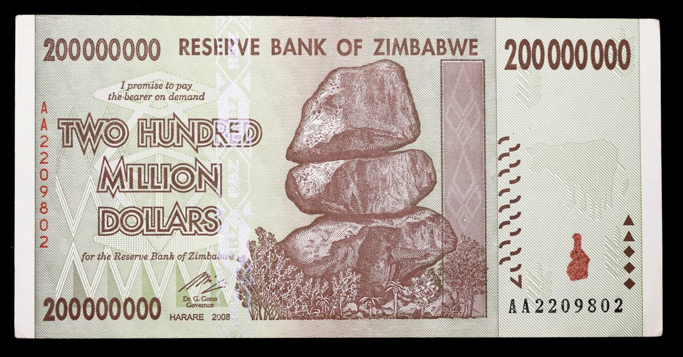 2008 Zimbabwe 200 Million Dollar Notes P: 81B Grades Select AU. During the years of 2008 and 2009, The inflation rate of the Zimbabwe Dollar Grew to 250,000,000% at its peak. This was later linked to the Central Bank uncontrollably printing money and the global economic crisis and the time.
