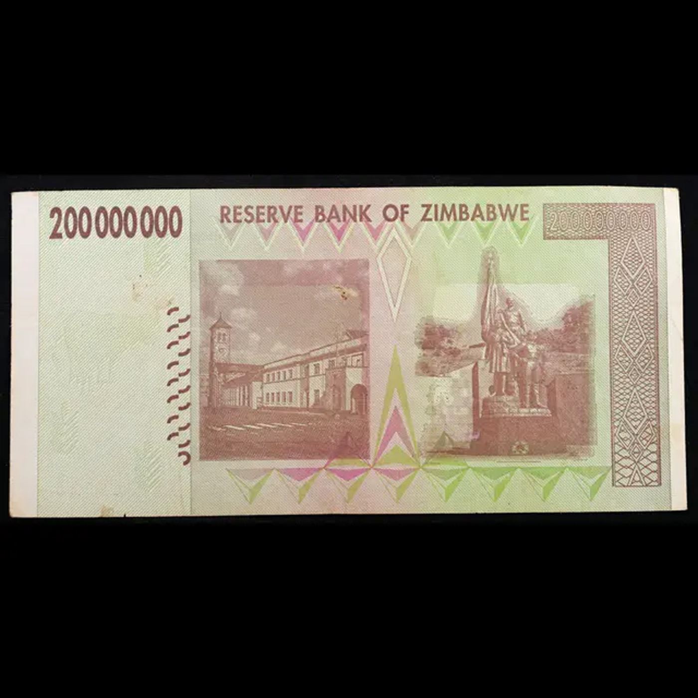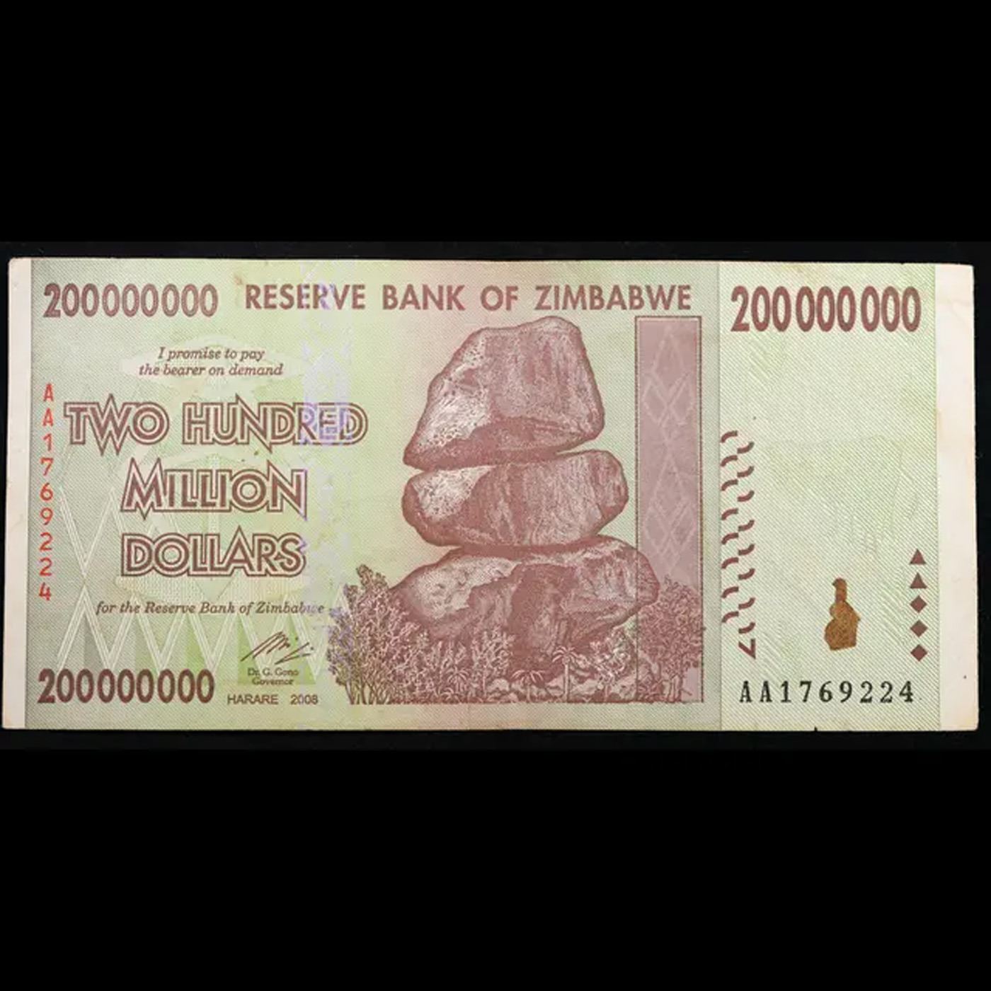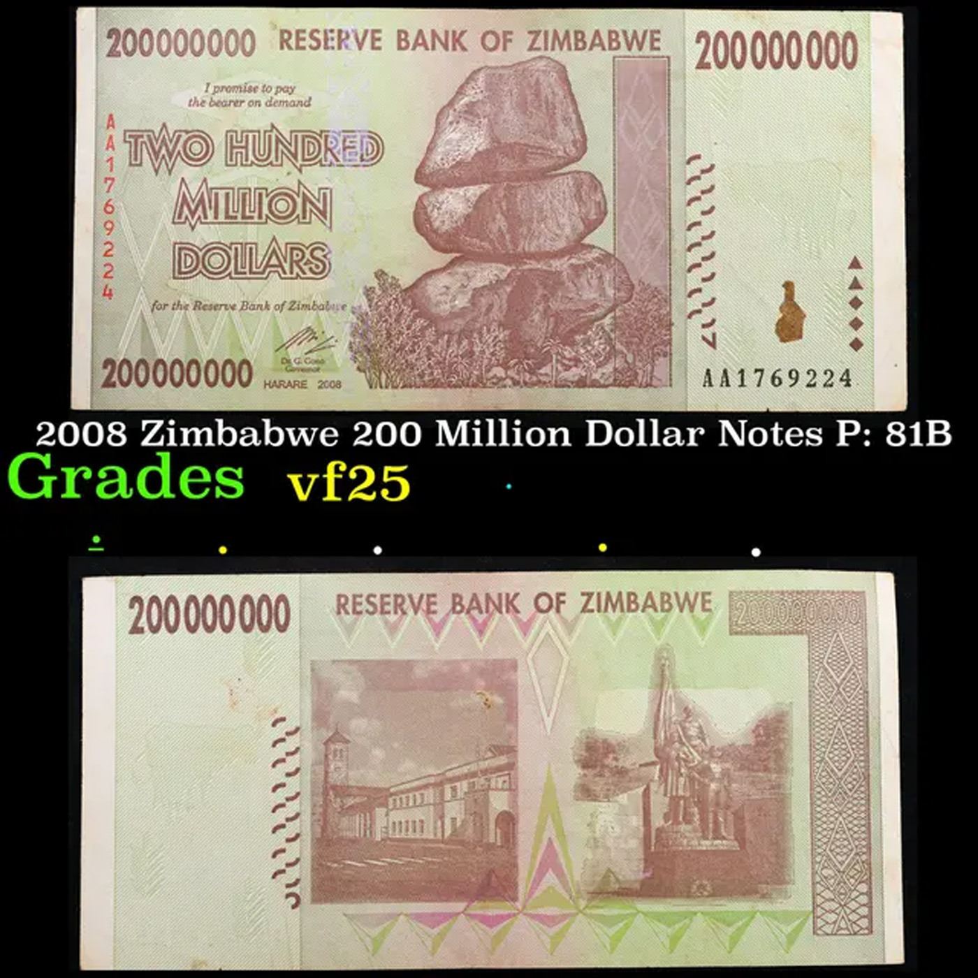 2008 Zimbabwe 200 Million Dollar Notes P: 81B Grades vf+. During the years of 2008 and 2009, The inflation rate of the Zimbabwe Dollar Grew to 250,000,000% at its peak. This was later linked to the Central Bank uncontrollably printing money and the global economic crisis and the time.