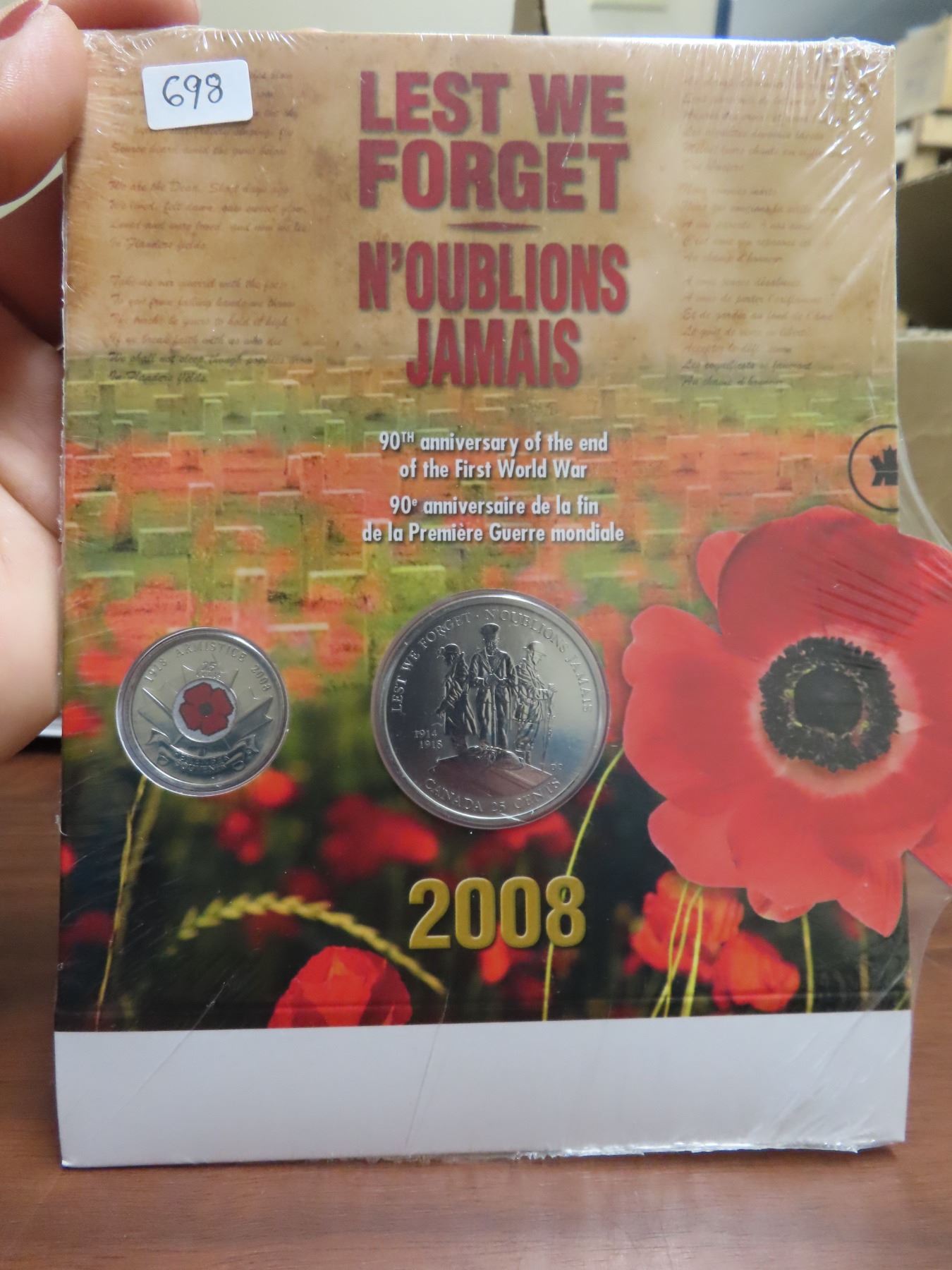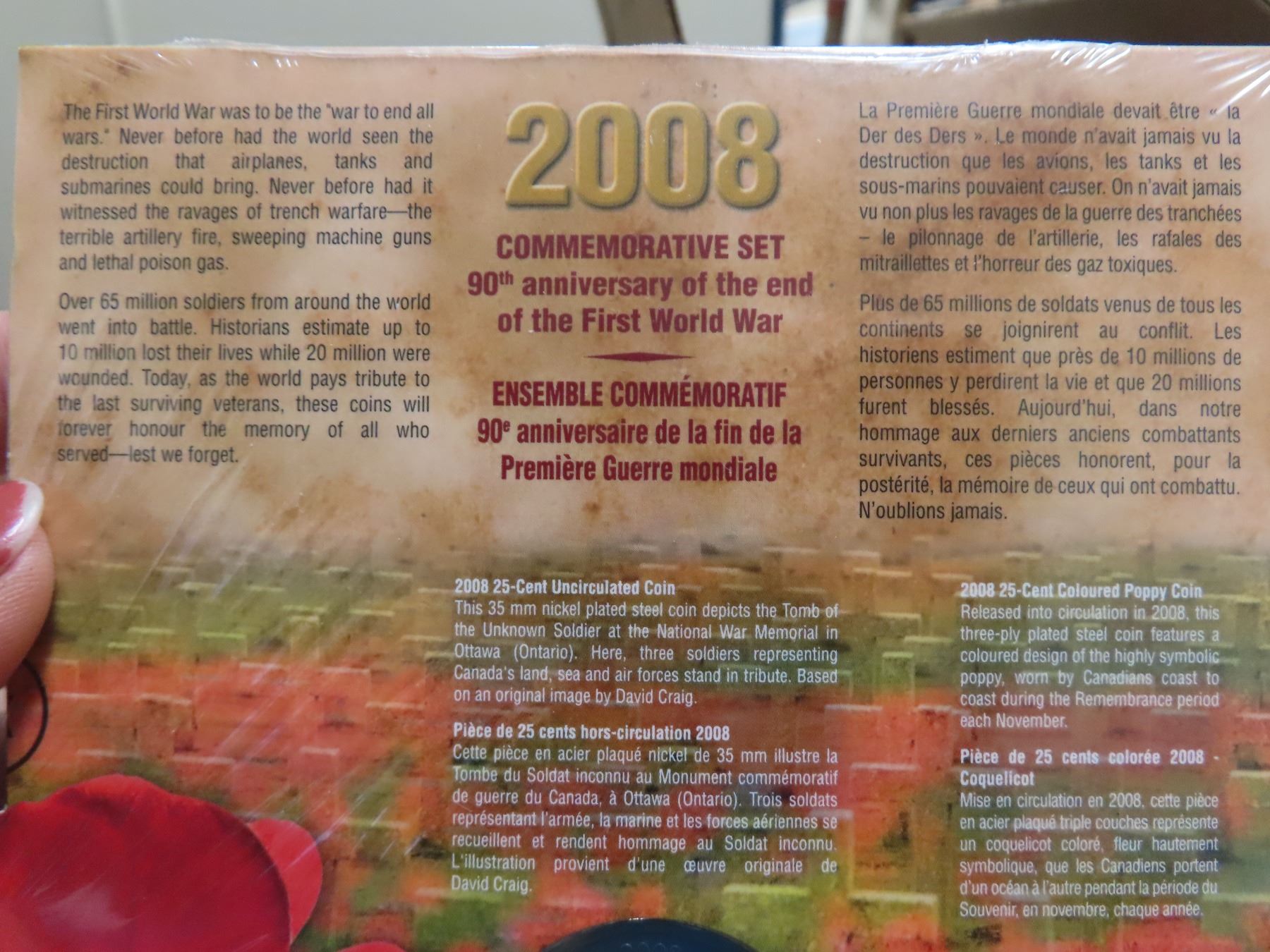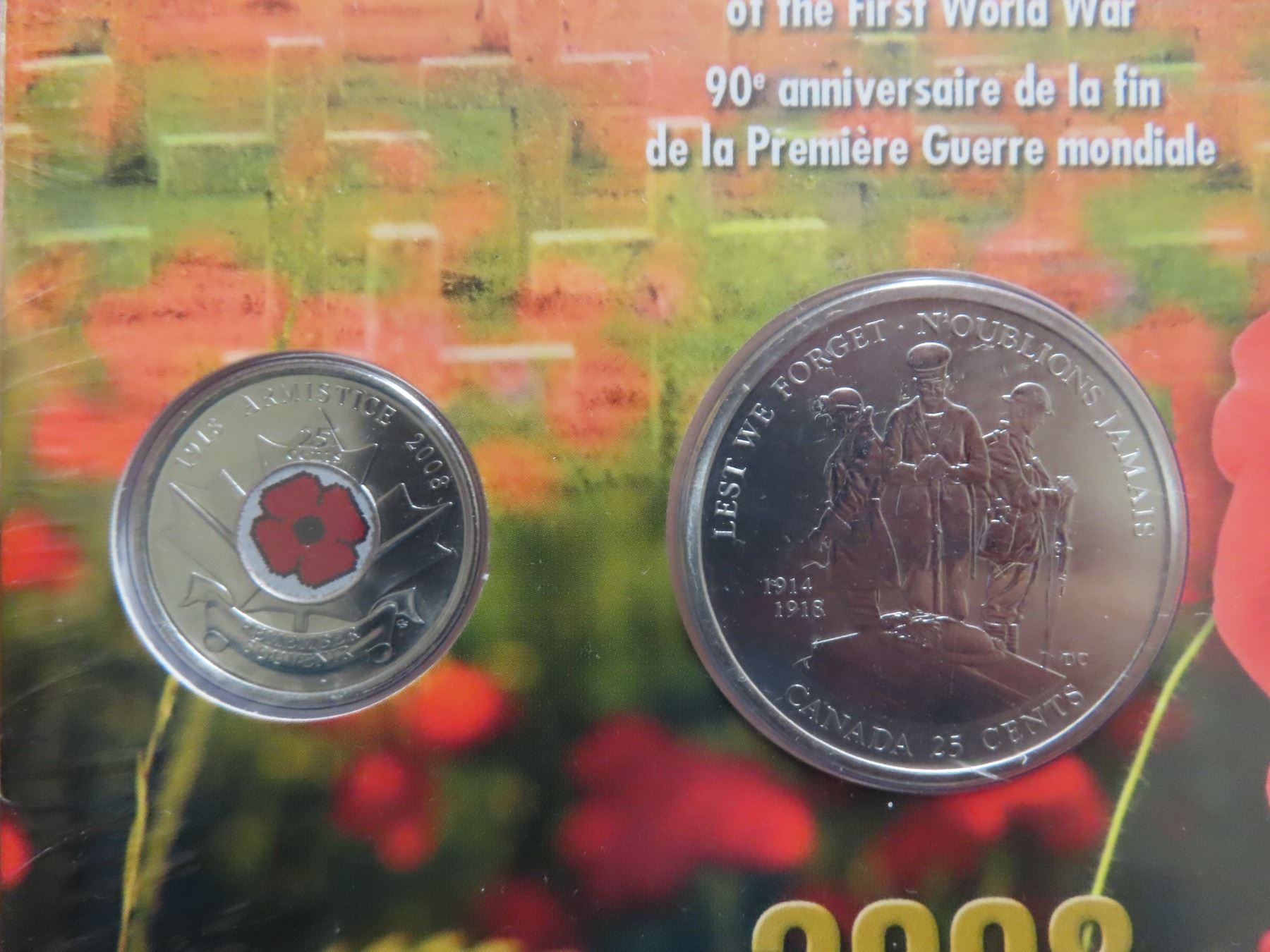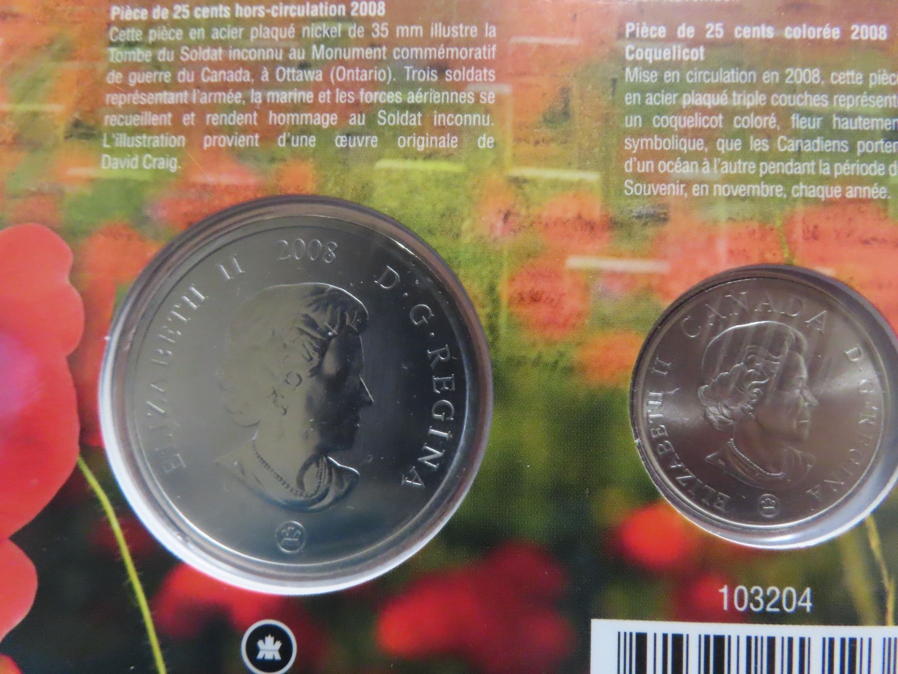2008 canada 'lest We forget' UNC 25 cent coin & colored poppy 25 cent coin set