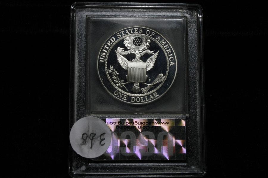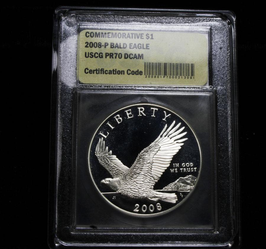 Minted to commemorate the recovery of the Bald eagle Species, the dollar illustrates a dramatic Bald eagle in Flight and the seal of the US on the reverse. PCGS lists PR70 DCAM as $450. This Perfect coin is graded PR70 Deep cameo by USCG. Estimated Value $150
