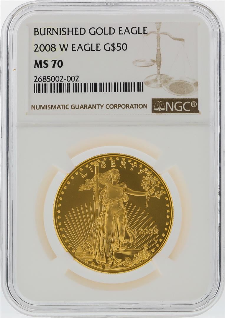 One 2008W $50 1 oz Burnished Gold Eagle NGC MS70. NGC Certified.