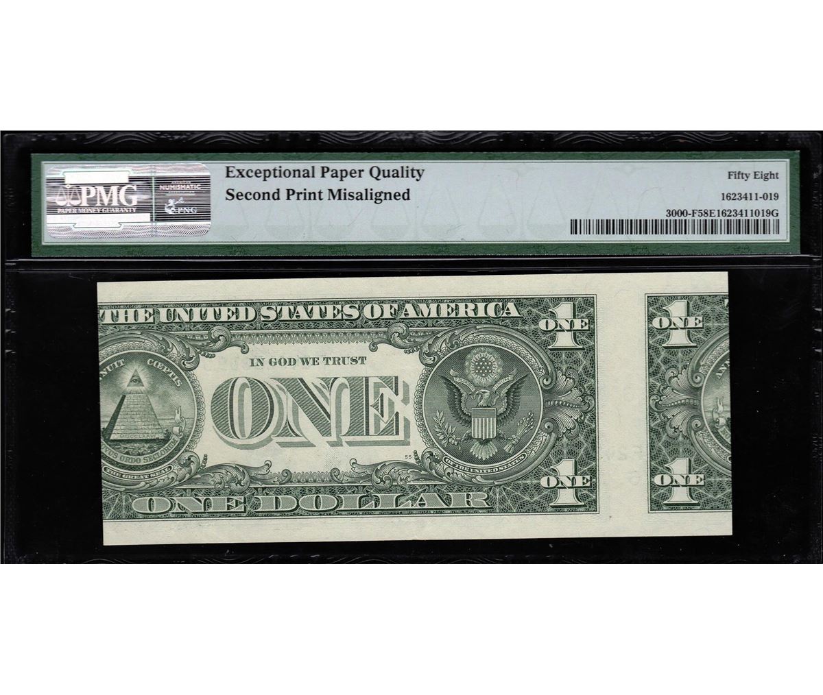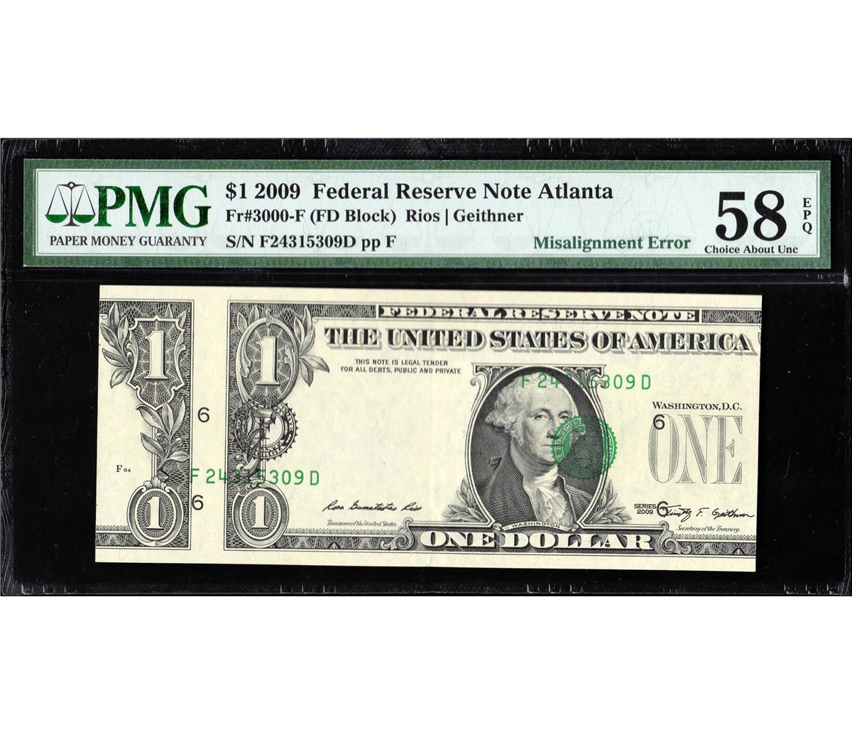 One 2009 $1 Federal Reserve Note Atlanta Misalignment ERROR PMG 58EPQ. PMG Certified.