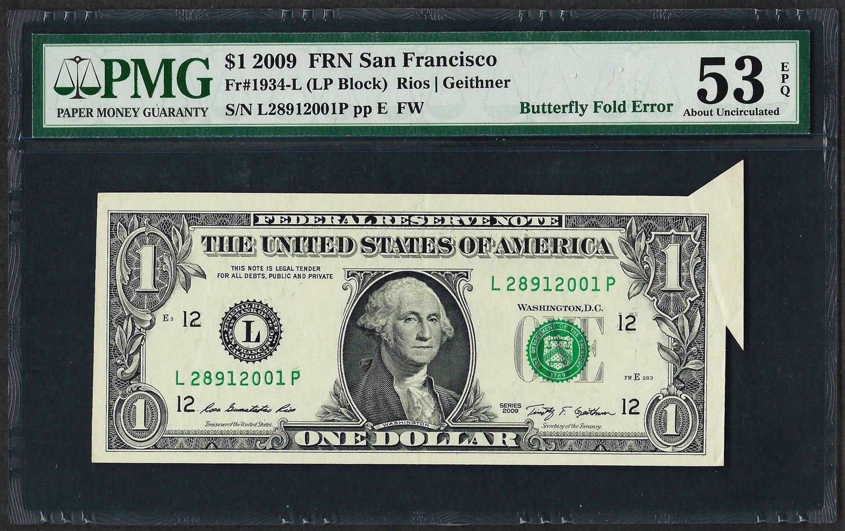 One 2009 $1 Federal Reserve Note ERROR Butterfly Fold PMG About Uncirculated 53EPQ. PMG Certified.