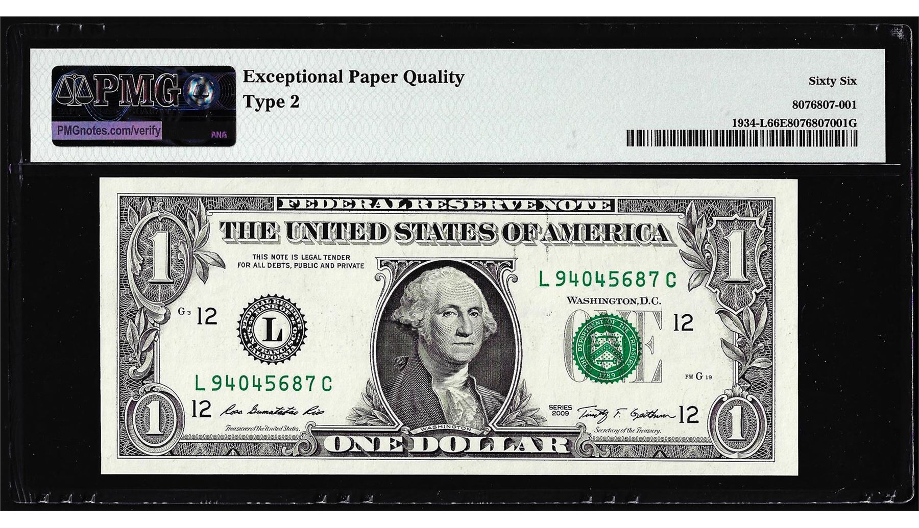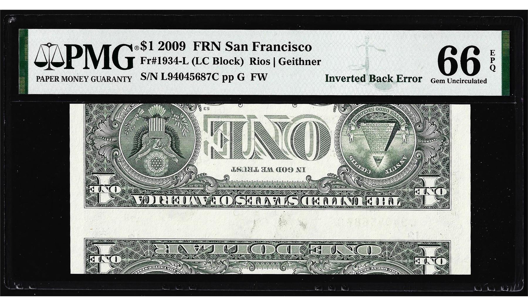 One 2009 $1 Federal Reserve Note Inverted Back ERROR Fr.1934-L PMG Gem Uncirculated 66EPQ.