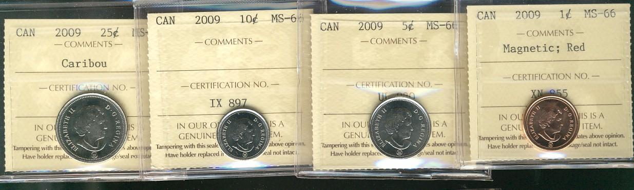 2009 1¢ Magnetic, 5¢, 10¢ & 25¢ caribou ICCS MS66. Lot of 4 coins.