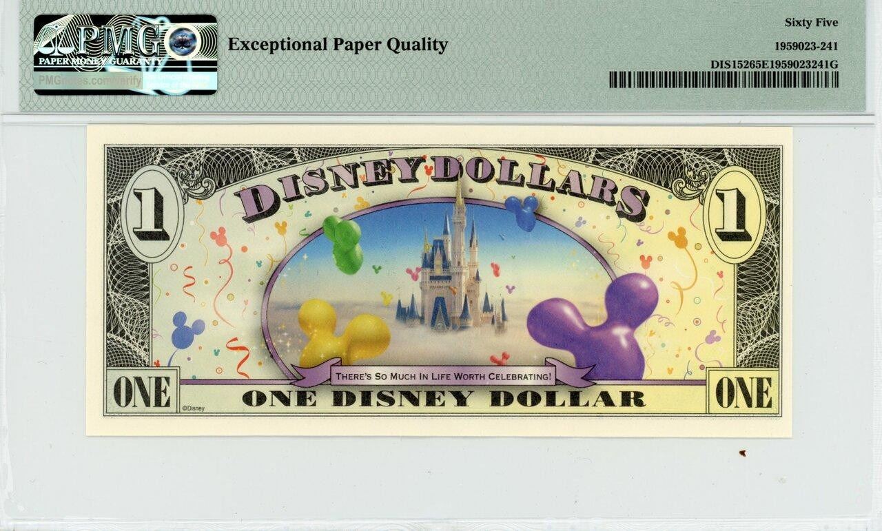 One 2009 $1 Mickey and Pluto Disney Dollar PMG 65EPQ.